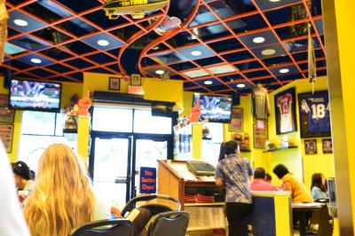 店内はスポ−ツバ−的雰囲気で、Tシャツ等販売あり、料理は薄味か⁉