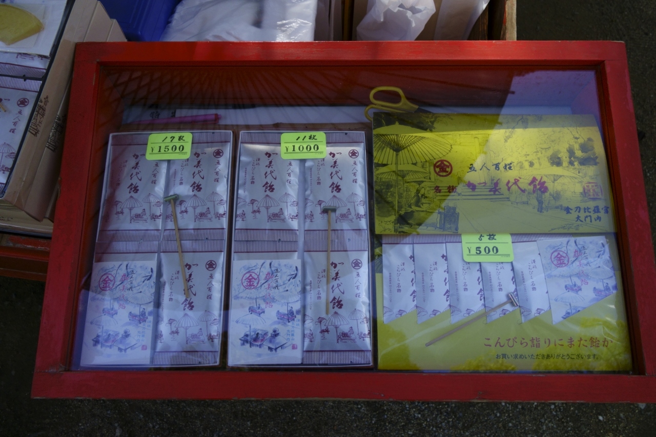 こんぴらさんの神域で唯一商売を許された「五人百姓」の末裔の御方が、加美代飴を販売しています。往路に一息ついたときに、ご馳走になり、元気百倍で、本殿迄参詣後、帰りに購入して帰りました。