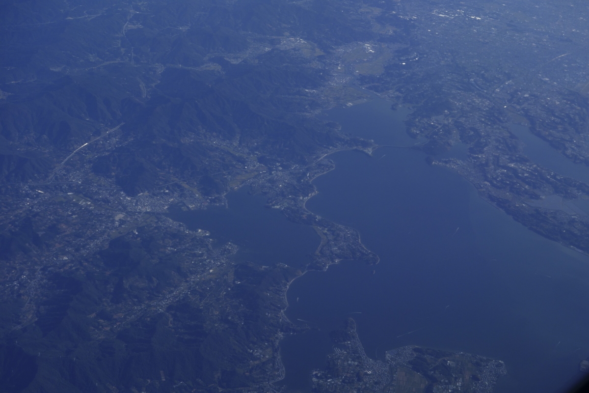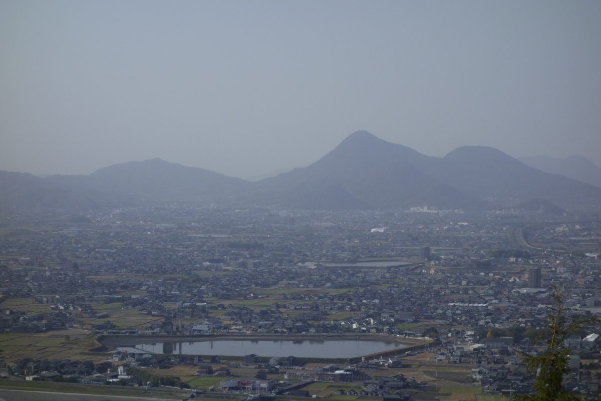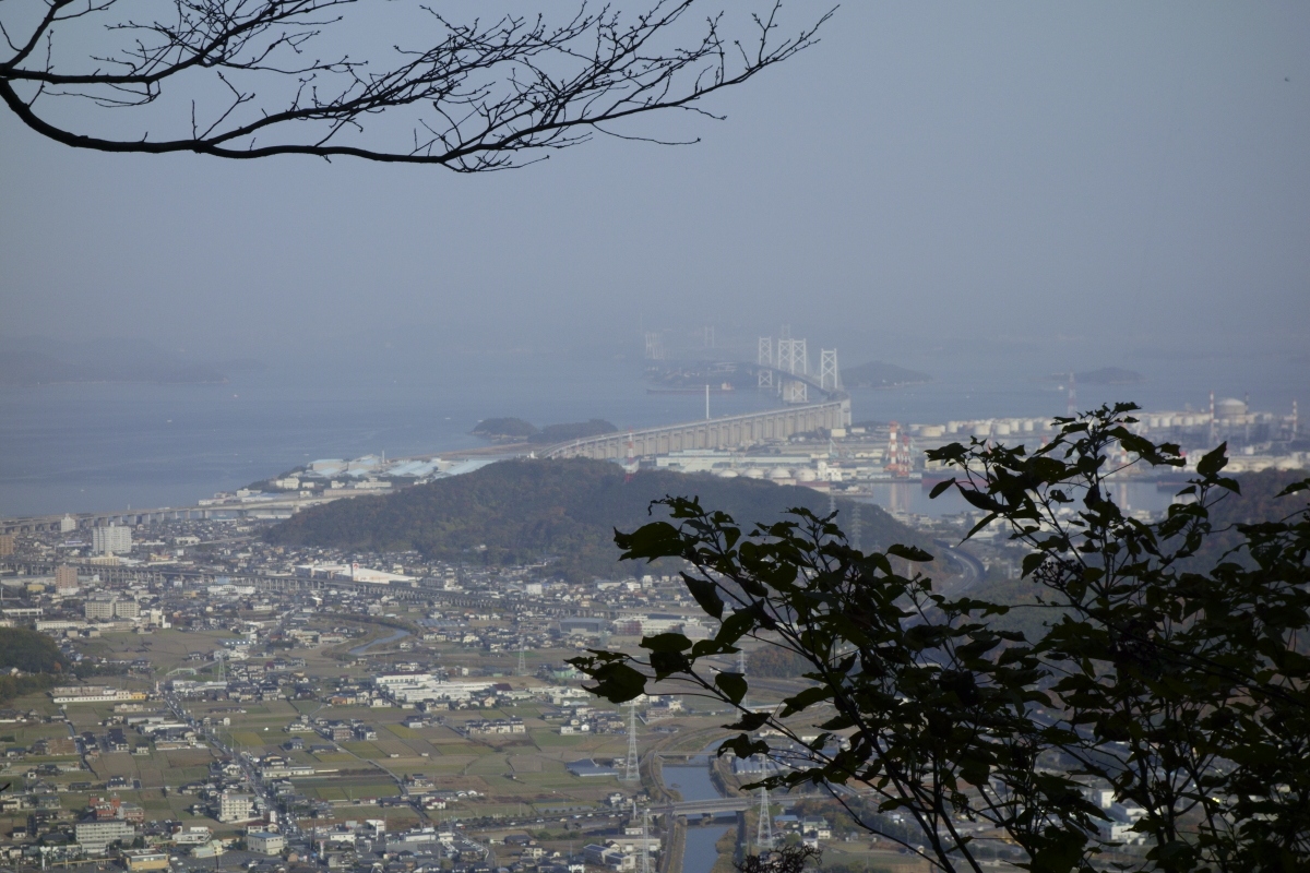 讃岐富士こと飯野山からは多くの香川県からの景色を望むことが出来ますが、北側の宇多津方向から岡山に向かって島伝いに架かる瀬戸大橋を見ることが出来ます。遠近感が大きく圧縮された景観になり、この時のように天候の佳い日には岡山側までも見通すことが出来ます。
