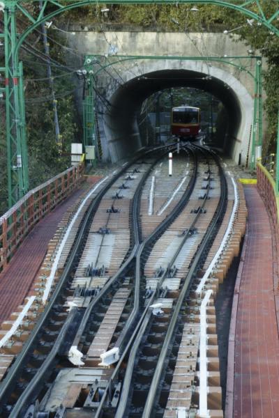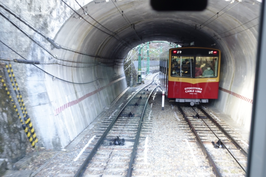 毎年、年始の石清水八幡宮参拝で賑わう京阪・男山ケーブル。この年は従来からのデザインの意匠でした。この塗装はこの年で見納め。貴重な記録ということが言えます。単線の行き違いは、その面白い線路構造が楽しくもあります。一瞬見える京都盆地と、京阪本線のトラス鉄橋のダイナミックな姿も楽しい。
