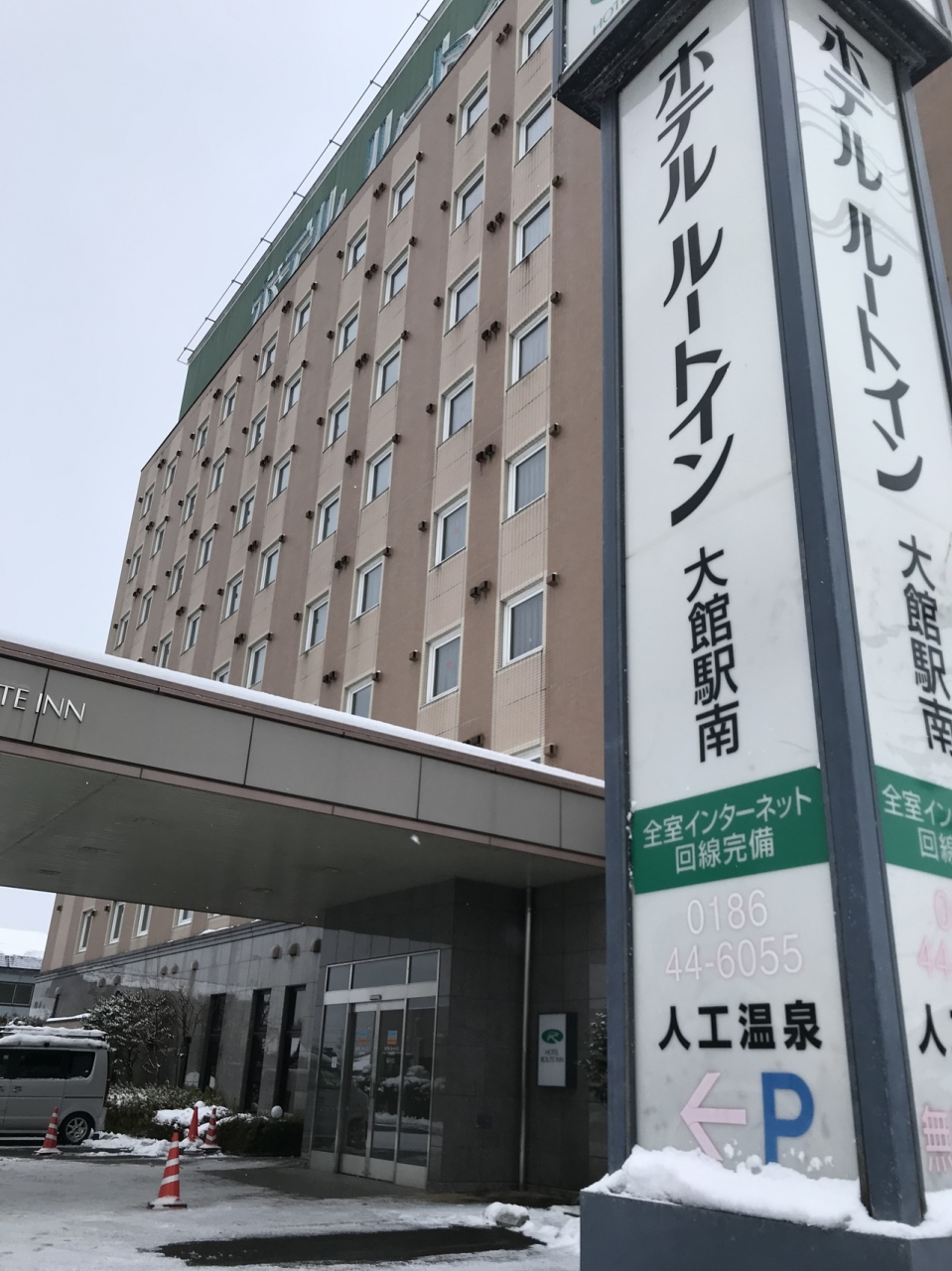大館能代空港からのシャトルバスはホテルからすぐのバス停(中道一丁目)に停まりますが、大館駅からは10分程度かかります。 大雪だったので徒歩移動が大変でした。