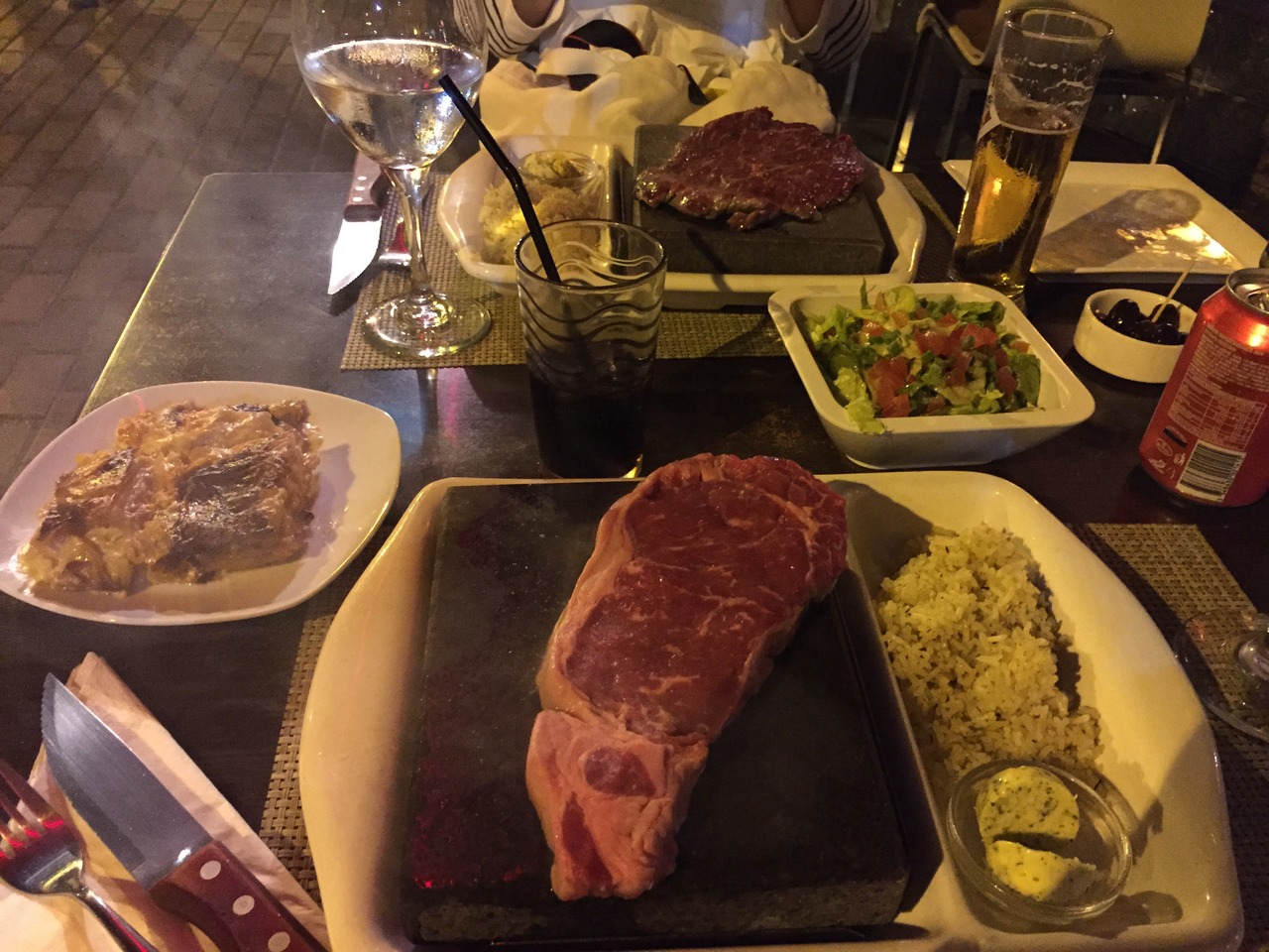 お肉は生の状態で運ばれてきて、熱々の石で自分で焼くスタイル。私はサーロインステーキ250gを注文しましたが、美味しかったです。