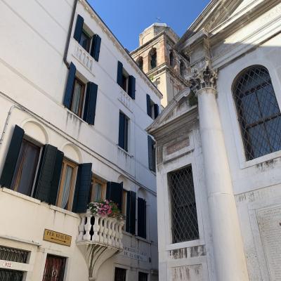 細い路地。ベネチア は建物の壁に、主な観光場所の方向を教える表示板があ...