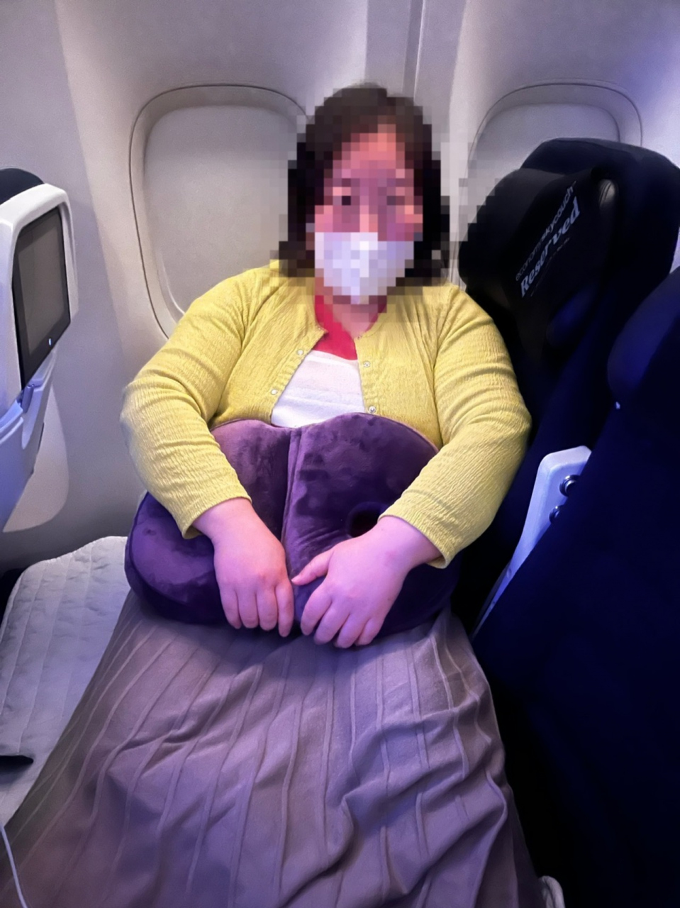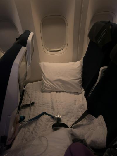 結局、フットレストを2席分フルフラット仕様にして私が座椅子みたいな感じで座り、母はフットレストをちょっとだけ使い、プレミアムエコノミー感覚で座って移動しました。 それなりに快適でしたが、もしも次に利用する場合は、1人で利用したいなと思いました。