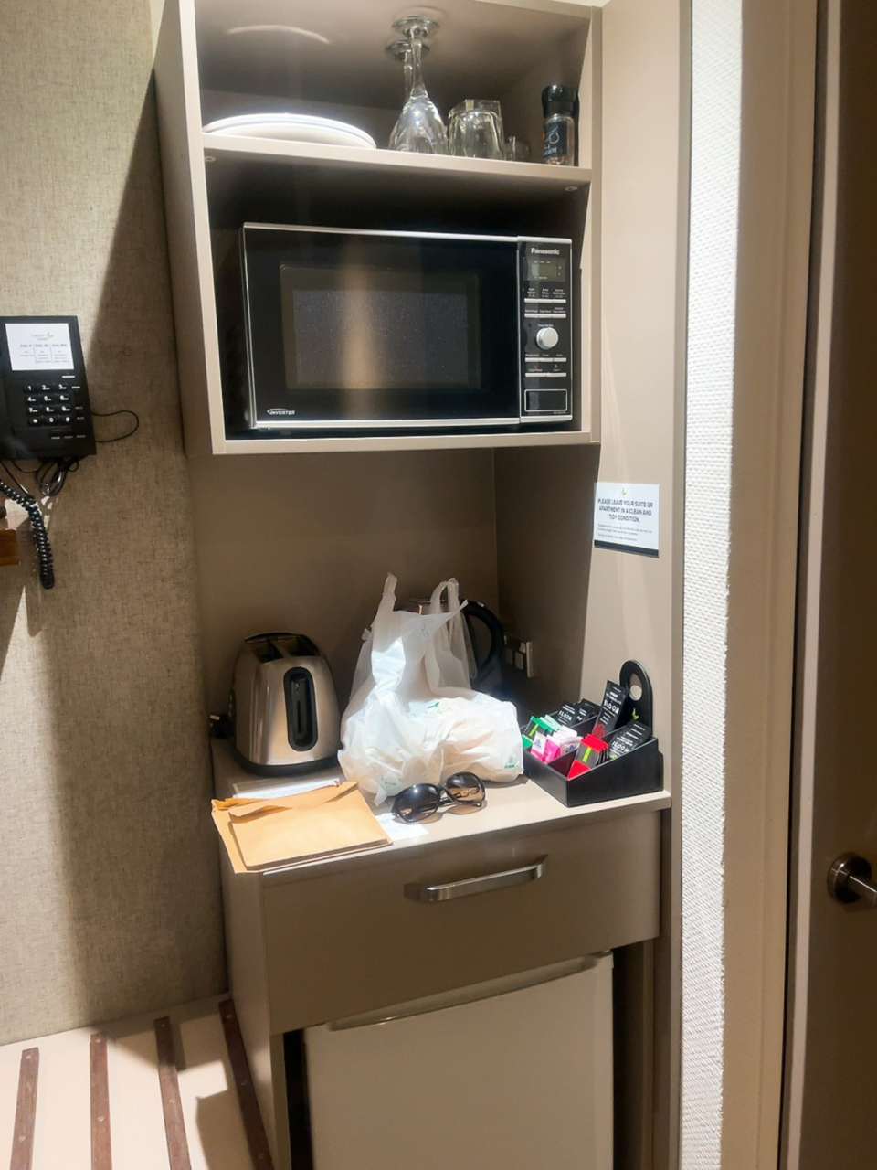 冷蔵庫(保冷庫)が小さいのは想定内。 電子レンジが部屋に付いていたのがめっちゃ便利でした!