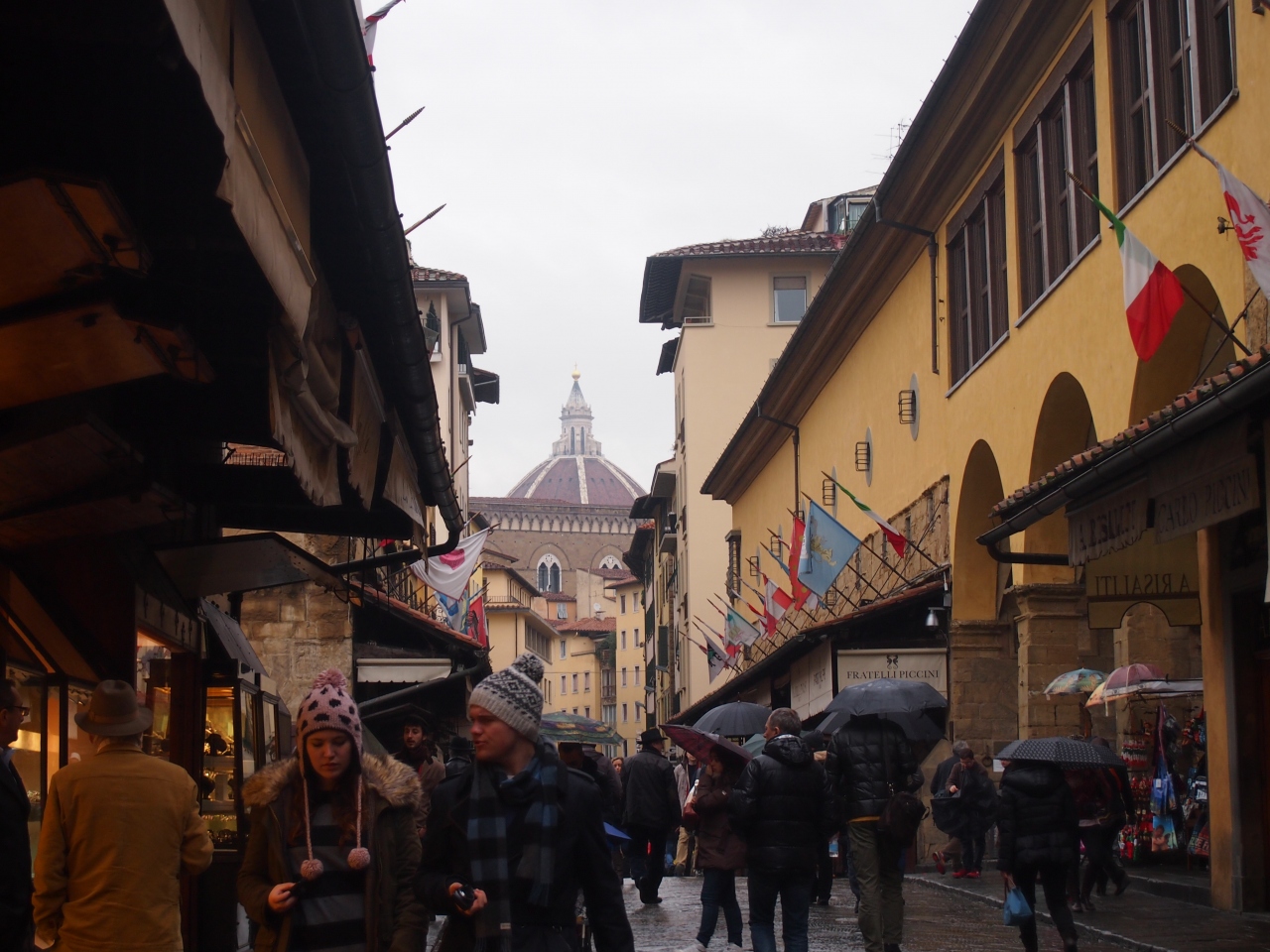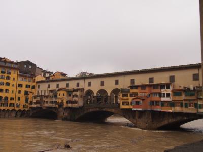 フィレンツェに来たら、ココを訪れないと!という場所の1つなので、雨の中行ってみました。 橋の両脇に、貴金属店が並びますが、増築を重ねた感じで、あまり小奇麗な印象はナイです。 両脇には色々とお店がありますが、屋根はナイので、雨が降っていれば濡れてしまうし…。