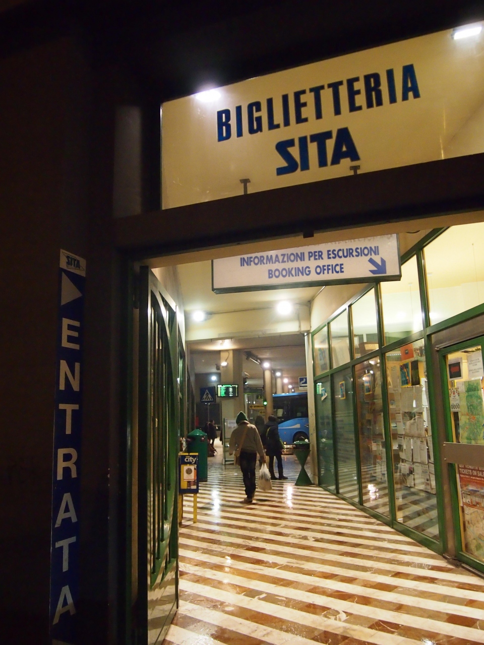 フィレンツェSMN駅の近くにバスターミナルがありますが、入り口自体がデカデカと分かりやすく目印があるわけではないので、めちゃくちゃ迷いました。 タイミング良く、大型バスが右折してどんどん入っていく場所を見つけて、ようやくそこがターミナルの入口だと分かったくらい…。 エアポート行バスの乗り場は、1番(2014年2月現在)。 バスは30分に1本です。