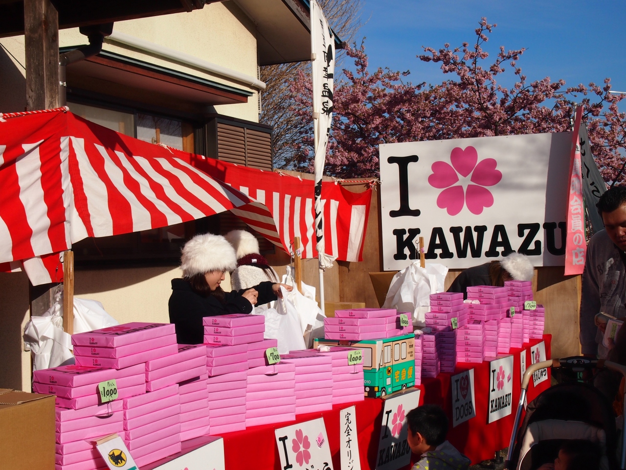 河津桜まつり期間は、平日でも屋台が出て賑わっていて、地元の方がとっても頑張っています! 屋台で1番多いのが、その場ですぐに食べることの難しい魚の干物屋さんっていうのが、何とも静岡らしいかなって感じです。