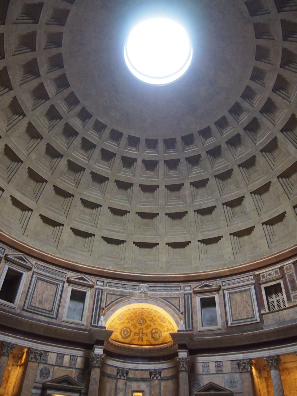 パンテオンの天井には、オクルスと呼ばれる、ラテン語で"目"を意味する穴が開いています。 この穴の部分はガラスか何かでカバーがされていると思っていたのですが(何か落ちてきたら危険だし)、昔のまま穴が開いた状態で保存されています。 この開口部の真下部分にはロープで囲いがしてあって、雨が吹き込むので床がビショビショでした。