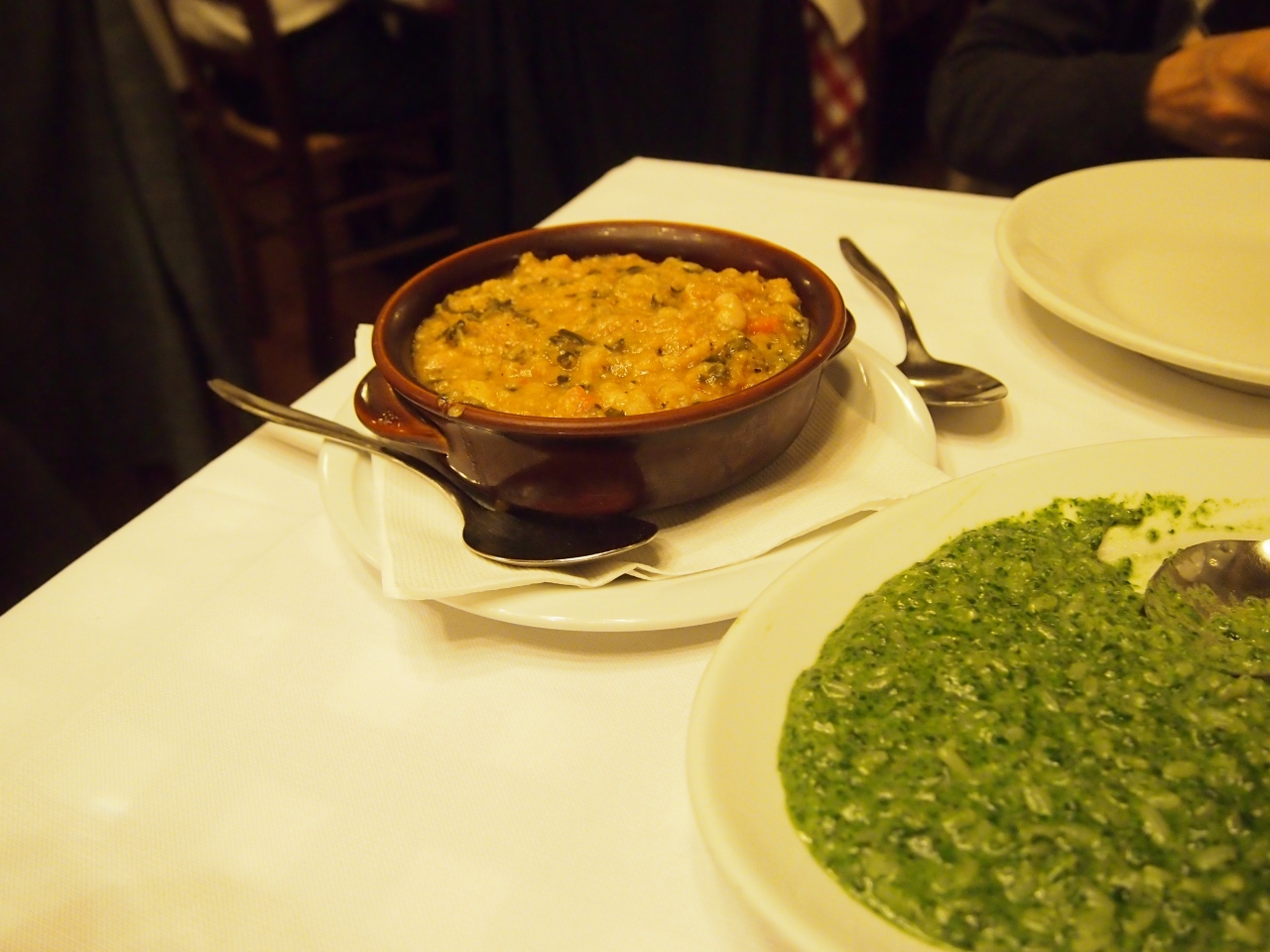 日本人観光客の数も結構多いです。 そして、サイトでも紹介されていたこともありほぼみんながほうれん草とチーズの緑のリゾット(Risotto Verde)を注文してます。 濃厚な味とにおいなので、出てきたときは量が少なく見えますが、実際には2人でシェアしてちょうどいい感じ。 フィレンツェ名物の豆のスープ、リボッリータもなかなか美味しかったそうです。