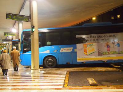 フィレンツェSMN駅→フィレンツェ空港(FLR/アメリゴ・ヴェスプッチ空港)までのバスの乗り場は、案内などが出ていないので分かりにくいです。 バスのチケット売り場の人や観光案内所のスタッフに聞いても、イタリア語訛りの英語であまり良く聞き取れなかったし…。 空港行きのバスだから、英語を始め、色々な言葉で案内されていたり、マークが出てる物だと期待していましたが、全くありませんでした。 乗り場の案内も、イタリア語のみで、"Aeroporto Peretola"とだけ書いてありますが、これがフィレンツェ空港です。