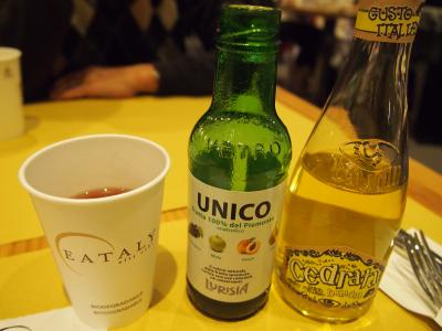 私たちは、値段的にもフツーのスーパーのほうが性に合ってるらしく(苦笑)、このEATALYでは買い物らしい買い物はほとんどしませんでしたが、2階のフードコートのような場所で食べたピザが美味しくて感動しました! サイズも大きいナポリピザで、6.5ユーロというのが信じられないです! ワインやビールなど、アルコールメニューは豊富ですが、ソフトドリンク(ジュース)は1種類だけで、ミックスジュースがありました。 あとは炭酸類がいくつかあります。