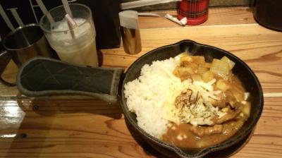1番の売りはやっぱり何と言っても、鉄のフライパンにそのまま熱々のカレーライスが調理されて運ばれてくること。 コースターを敷いてそのまま食べます。 飯盒炊爨の容器に入ったスプーンもシャベルみたいな形だし、お冷のおかわりは赤い水筒からセルフサービス。 この徹底ぶりが、子どもも大人も喜ぶと思います。