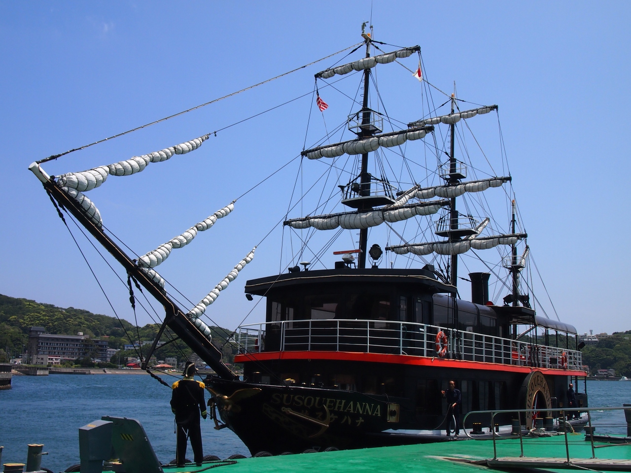 遊覧船は、ペリーが来航した時に乗ってきた黒船を模して造られていて、名前もサスケハナ号(Susuquehanna)で同じです。 黒船祭開催中だったからか、スタッフが幕末の格好をしてて、記念撮影もしてくれて良い思い出に残りました。