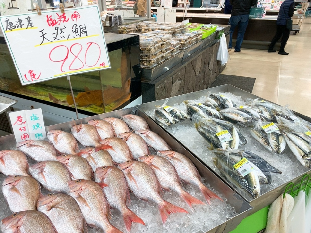 唐津を訪れた時に、カーシェアしてドライブに出かけた時に唐津うまいもん市場に立ち寄りました。 この日の夕食のおかずが何か見つかれば良いな~くらいの感覚で行ったのですが、めっちゃ新鮮な魚介類がたくさん売ってました。 旅行中だし、魚を捌く事も出来ないので、買う事は出来ませんが、見てるだけで楽しかったです。