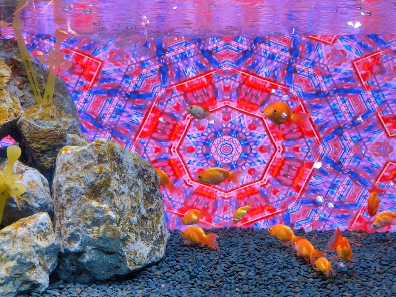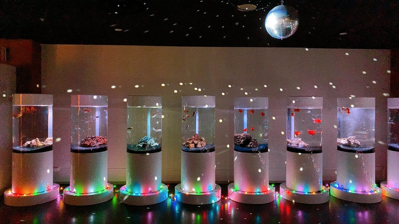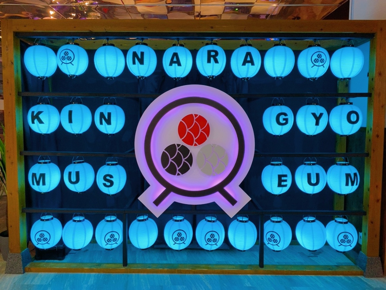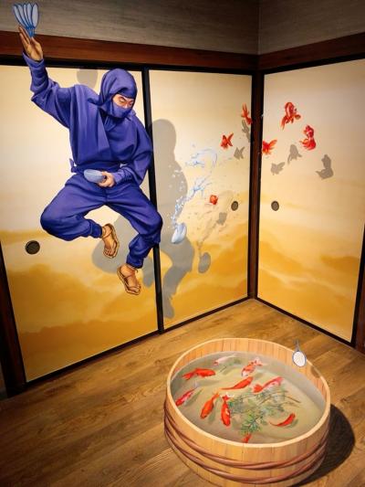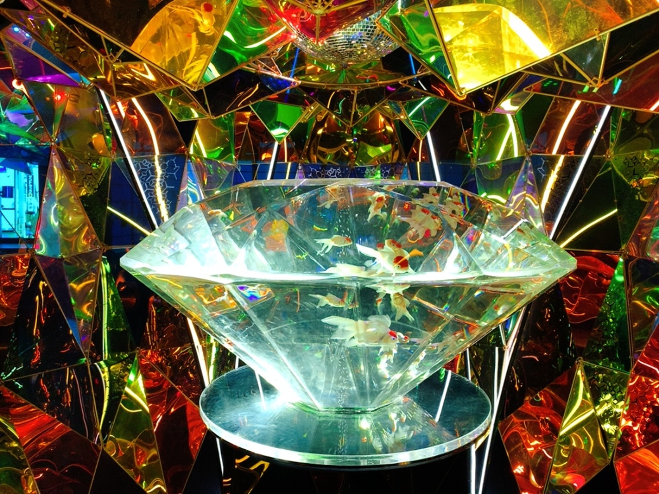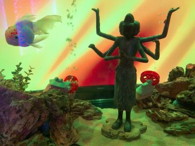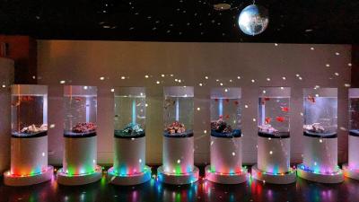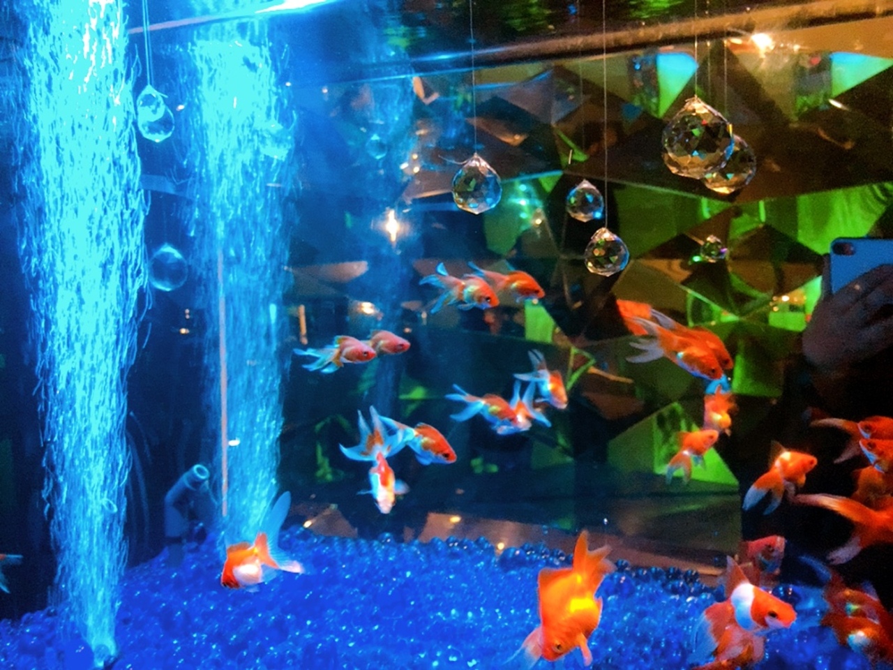 ホームページを見ると、なかなか楽しそうな施設に見えるのですが、実際には飾りがキレイなお祭り屋台みたいなエントランスでした。 中の展示は、珍しい種類も含む、色々な金魚が、ライトアップされた水槽や、花で埋め尽くされた水槽で泳いでます。 結構ミュージアム内は暗いので、ライトアップが映えてキレイでした。