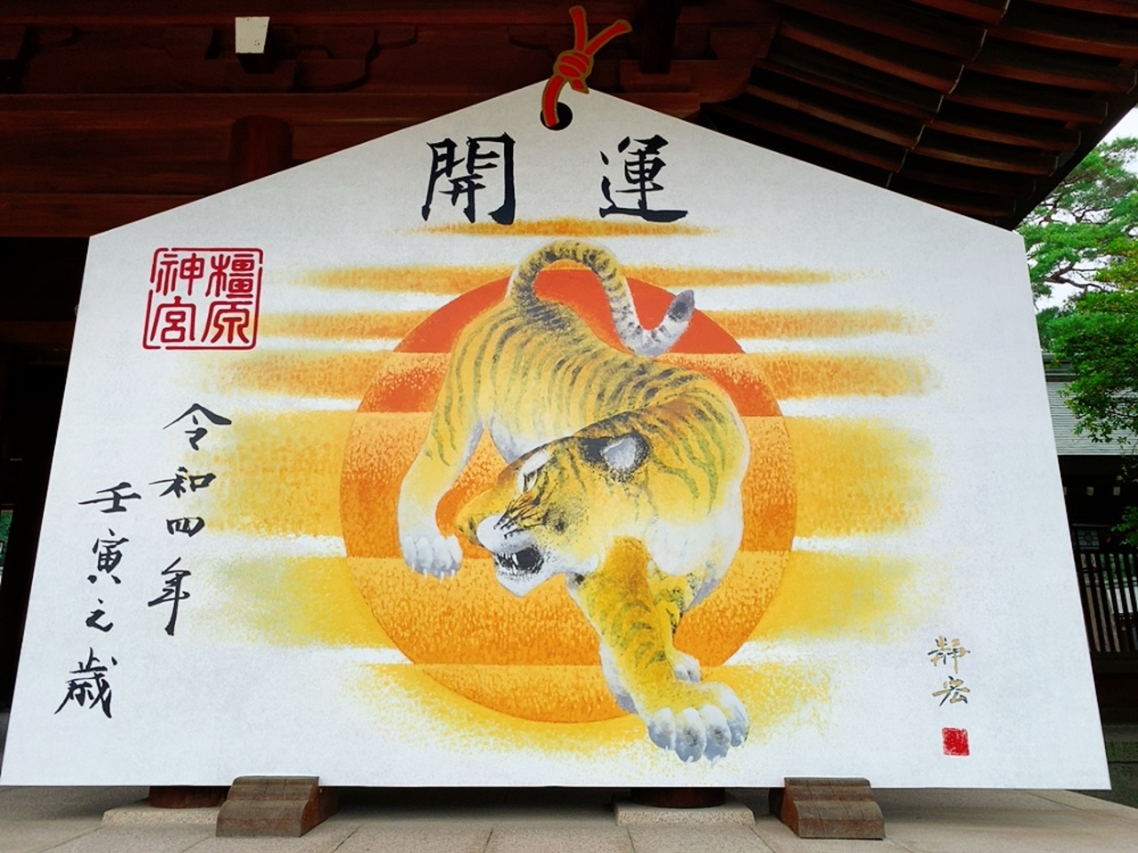 その年の干支の大きな絵馬が飾られています。 天皇家に縁がある、とても大きな神社です。