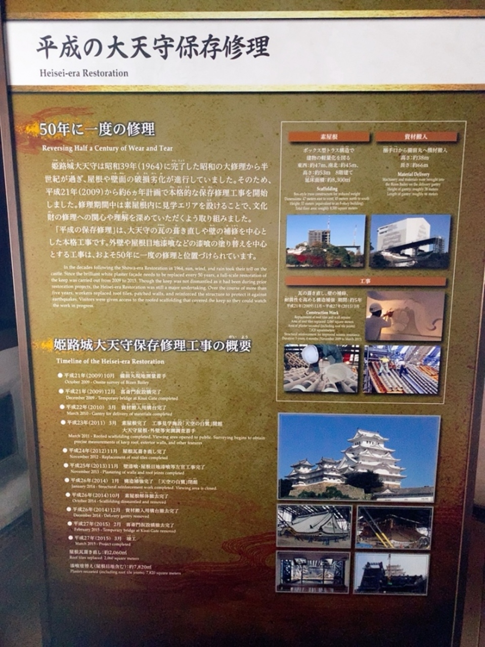 姫路城で2009年から約5年半に渡って行われていた平成の大修理。 大天守の屋根瓦などの全面葺替えと、上部の外部大壁を解体し傷んだ軒裏・破風等の漆喰塗が修理され、構造的な確認をしながら構造補強も行われたそうです。