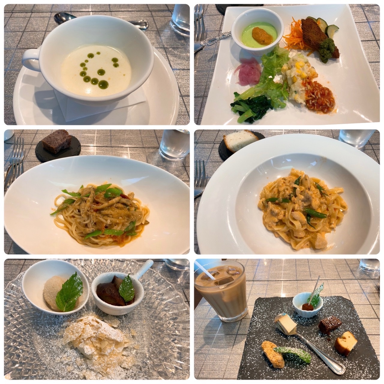 スープ、前菜、パスタ2種類、デザート2皿、ドリンクとなり、結構なボリュームです。