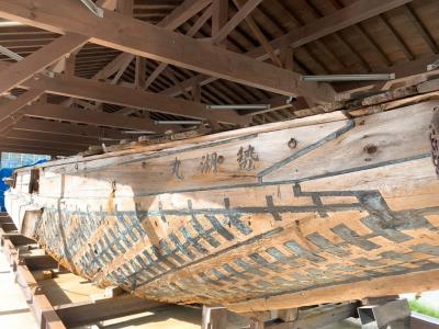 道の駅の建物の裏側には、コスモス畑が広がっててキレイだったのと、丸子船が展示されていました。 琵琶湖特有の木造船・丸子船が展示されていました。 江戸時代に、北国諸藩から大阪に向けて年貢米を始めとする食物が、逆に大阪や京都からは陶器、漆器、反物、着物が運ばれたのですが、琵琶湖を経由して運搬するときに活躍した船だそうです。 なかなか立派な船でした。 すぐ近くに、丸子船に関してもっと詳しく知ることが出来る、丸子船の館があるようでしたが、この日は時間がなくて行きませんでした。- 旅行時期