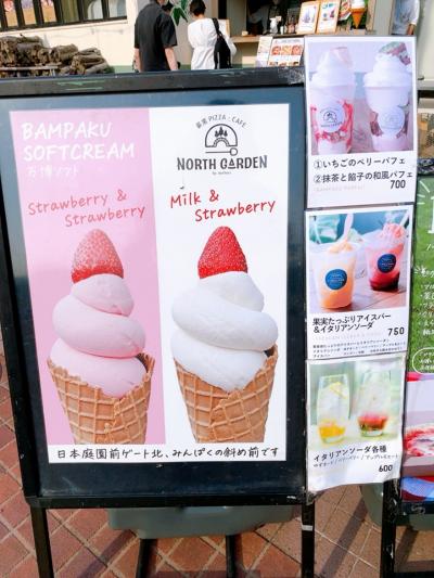 万博記念公園を訪れた時に、バラ園の見学の後にソフトクリームを食べました。 ソフトクリームの巻き方がカワイイ、万博ソフトというメニューです。 ストロベリーとバニラのミックスを注文。 上にいちごがちょこんとのってて何とも言えない可愛さでした! 味もまぁまぁ美味しかったです!