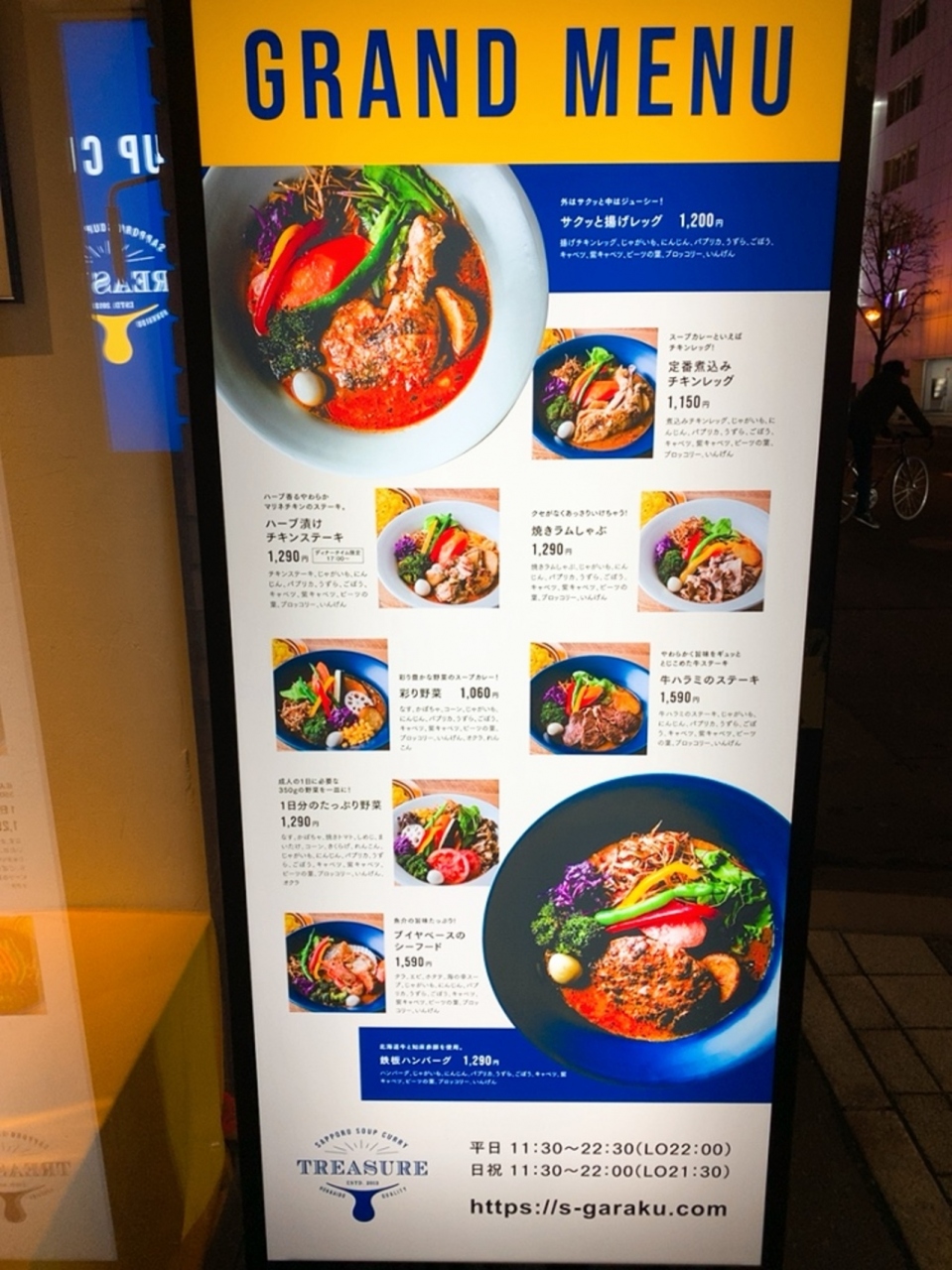 札幌旅行に行った時にディナーを食べたお店です。 札幌と言ったらやっぱりスープカレー! 数ある有名店の中で1番人気なのは、ガイドブックやクチコミなどを見てもGARAKUだと思うのですが、こちらトレジャーは、そのGARAKUの姉妹店だそうです。