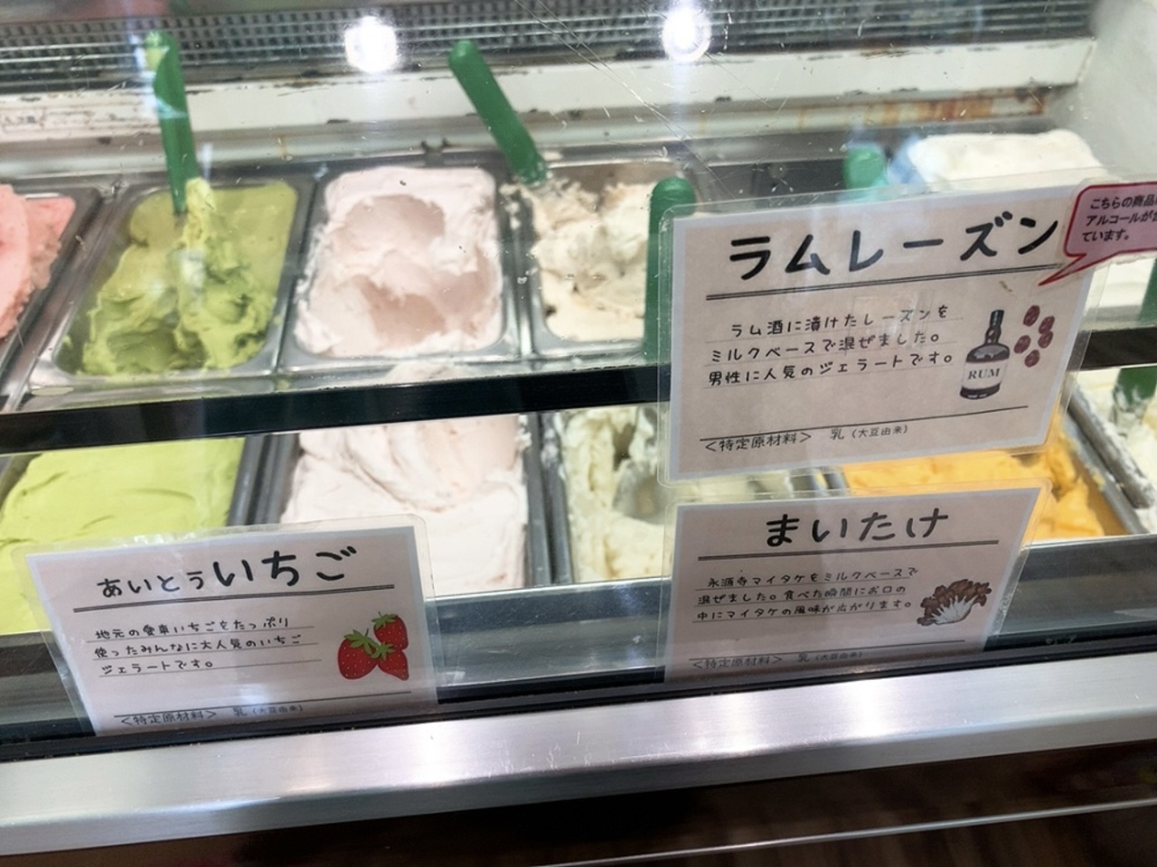 その中でも、時々出現する変わり種ジェラートがなかなか面白いです! 今回は何と! まいたけ味なんて言うのがあって、かなりチャレンジャーかな?とも思いましたが、頼んじゃいました。 この辺りでは、永源寺まいたけが有名で、味も濃厚。 それを使って作ってるジェラートです。 ミルクベースですが、香りもちゃんとほんのり舞茸、一口食べたら、本当にちゃんと舞茸の味がしてびっくり!! でも、不思議と、ジェラートとして成立しているというか、ミルクベースに合うのでとっても美味しかったです。 このまいたけ味のジェラートはまた絶対に食べたいです!- 旅行時期
