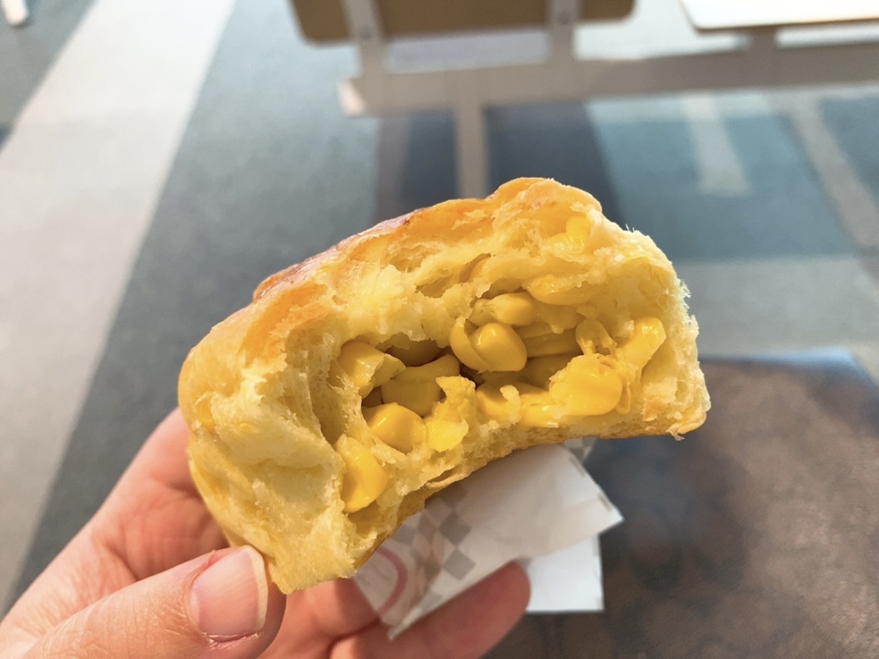 北海道旅行4度目にして初めて買えた、美瑛選果のコーンぱん。 もう、紙袋からして美味しそうでした。 焼き立てをどうしても食べたくて、飛行機に乗る前に1個だけ食べちゃいました。 確かにコレは並んででも買いたいパンかもしれない! でも、5個入りで1300円って、決して安いわけじゃないですね。