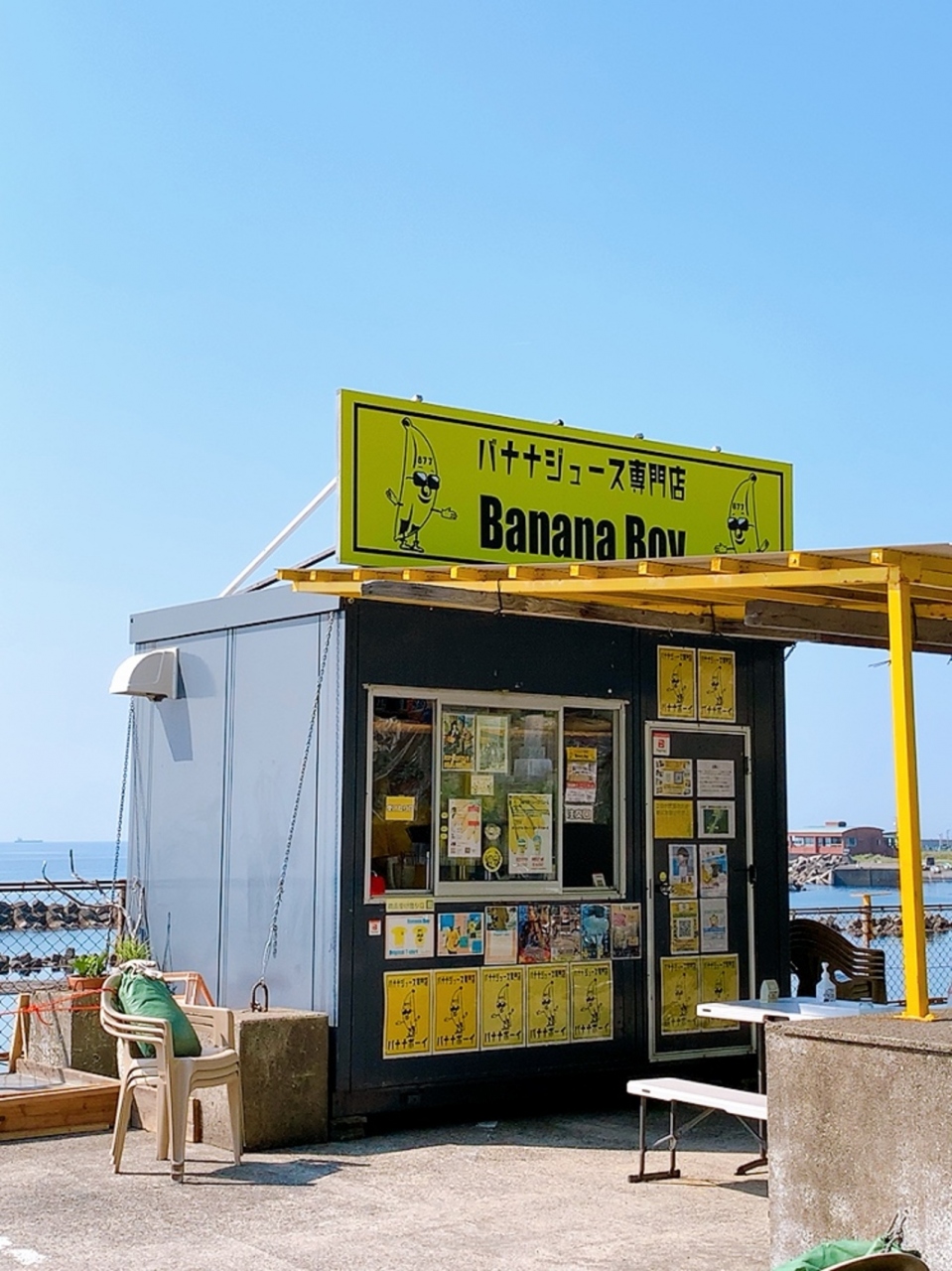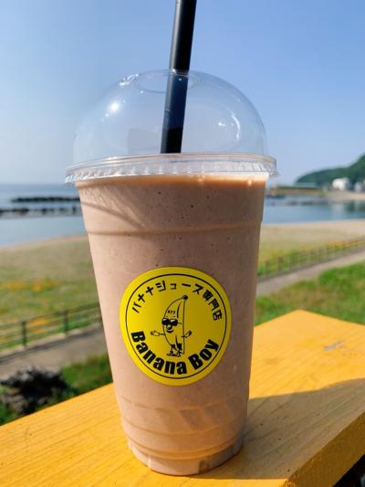 北陸自動車道の敦賀ICを下りて、しばらく越前海岸沿いを走った所にある、海鮮料理専門店「まつ田」の駐車場に、バナナジュース専門店があります。 実はこのバナナジュース屋さんに来るのは2度目です。 タピオカミルクティーの流行りが廃れてきて、巷でバナナジュースが流行り始めた?くらいに車で福井ドライブを計画して、訪れたことがあります。 その時飲んだプレーンも勿論美味しかったけれど、今回はココアトッピングで! LINEのお友達申請をしたら初回オーダー時のトッピング無料クーポンがあって、200円得しちゃいました☆