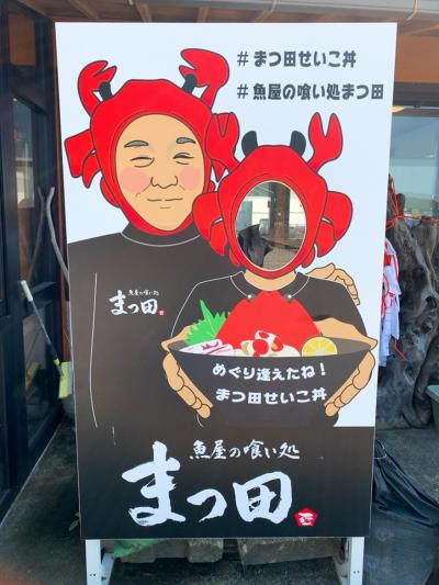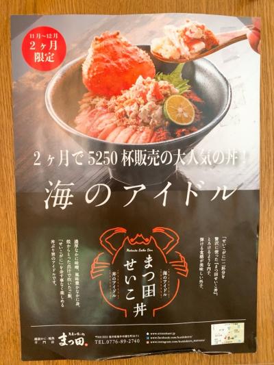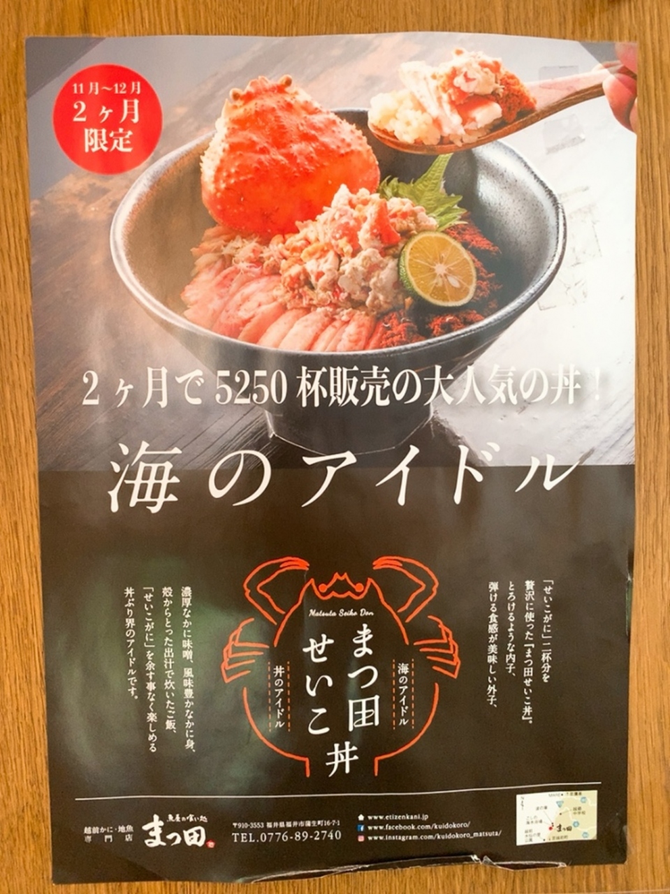 数年前にこのお店の存在を知ったのは、このメニューがきっかけでした。 インパクトあり過ぎですよねー。 セイコガニを2杯使った丼だそうです。 お店の名前の「まつ田」は、漢字で書くと、"松田"ではなく"枩田"だそうで、店名を敢えて「まつ田」にしてる理由が分かりました。