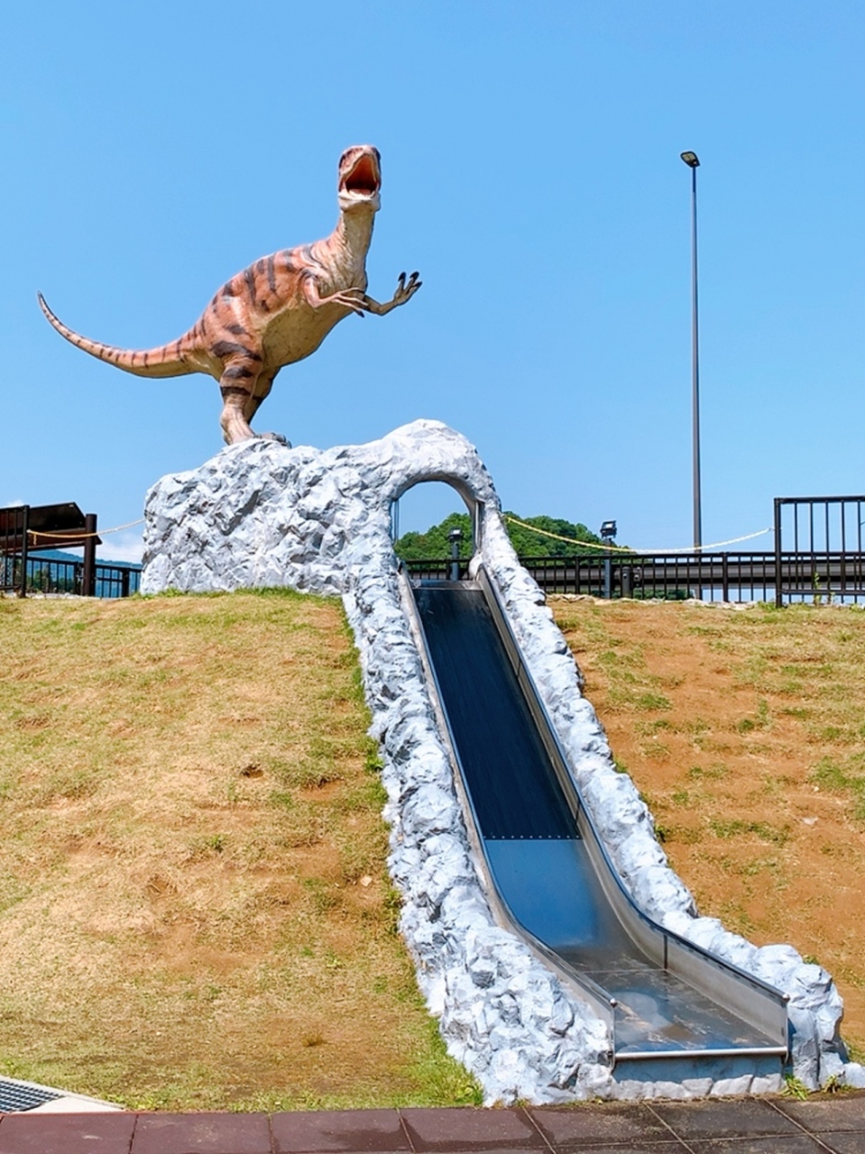 駐車場には、恐竜滑り台が設置されています。 恐竜推しの勝山だからというのもありますが、恐竜もかなりリアルで、初めて見たら小さい子どもだと泣き出すんじゃないか?って感じです(笑)。