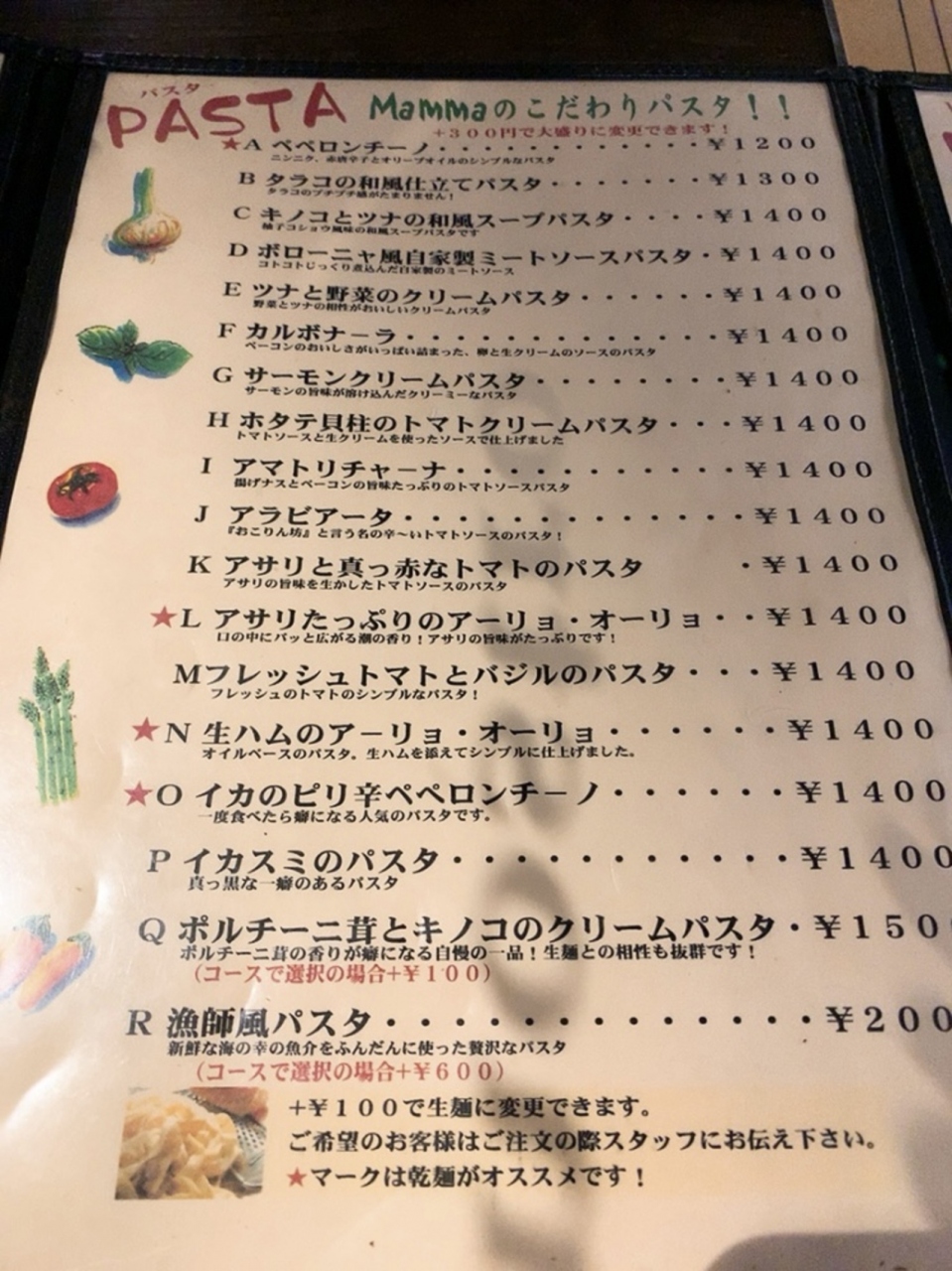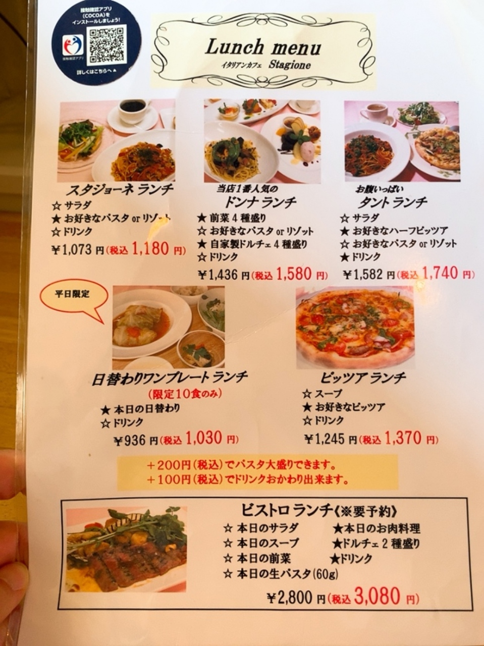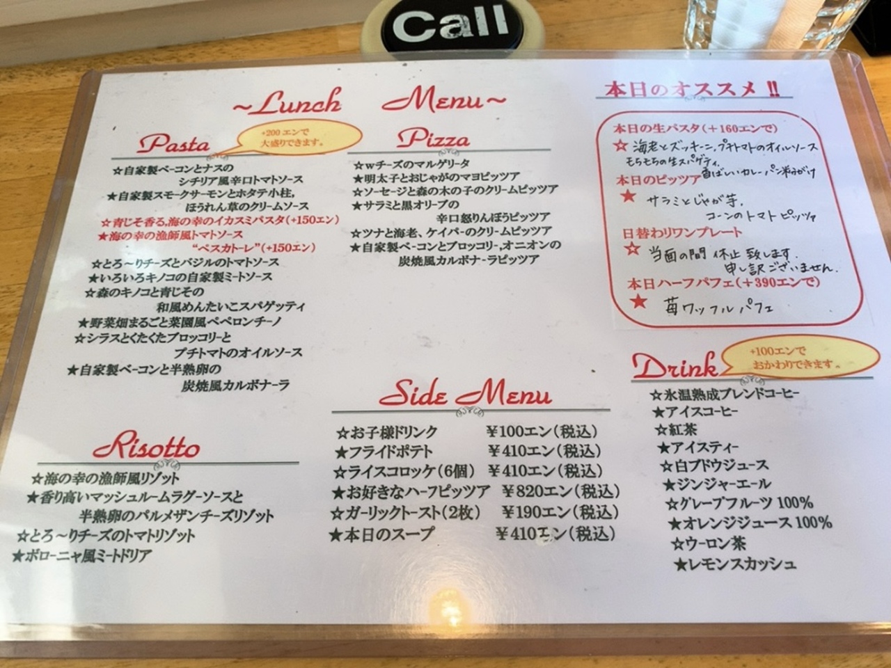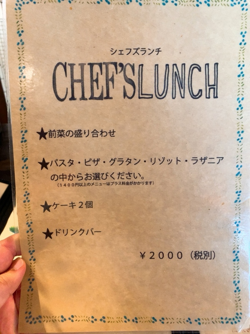 ランチのコースは何種類かあり、サラダ+パスタ(もしくはリゾット)+ドリンクの1000円ちょっとのコースと、前菜盛り合わせ+パスタ(もしくはリゾット)+ドリンク+デザートの1500円くらいのコースがあり、1500円のコースが1番お得で人気です。 私もこれを選びました。 メニューから好きなパスタを選ぶことが出来るし(追加料金発生するパスタも2種類だけありました)、大盛りにしたい場合は200円追加で出来るようなので、男性でも安心して頼めます。 前菜も丁寧に作られていたし、デザートは美味しいものをちょっとずつ、5種類ものってて幸せ気分でした。