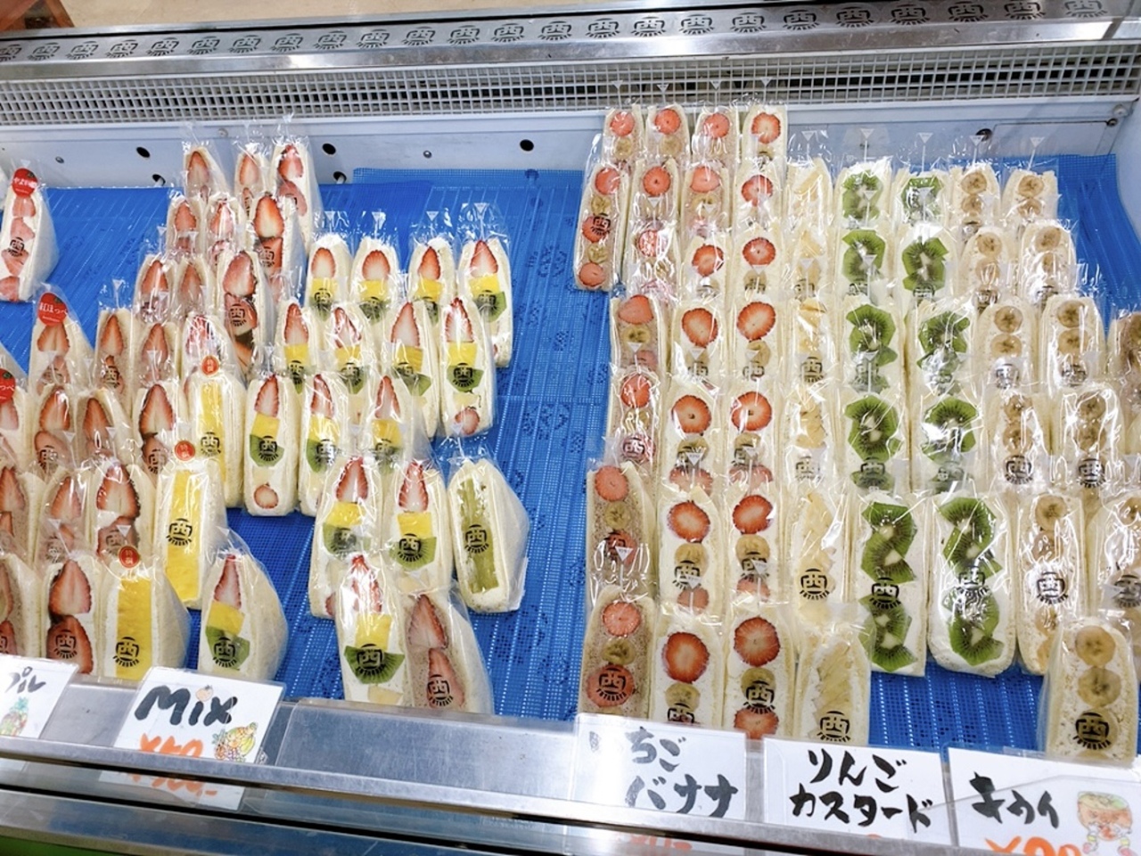 インスタでは、このお店のフルーツサンドを求めて大行列するお客さんの写真を見て来たので、並ばないと買えないのかなぁ~、わざわざ長浜まで行って、売り切れて買えなかったら悲しいな…って思ったのですが、行った日が雨模様だったからなのか、行列は無かったです。 店内の冷蔵コーナーに、たくさんの具沢山のフルーツサンドが並びます。