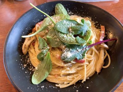 レギュラーメニューはチェーンで同じものが多いですが、今回はおすすめランチパスタセットを注文。 今までに食べた事ナイ、出汁の味がきいたペペロンチーノを頂きました。 個人的にペペロンチーノを自分から食べることなんてほぼナイのに、何故か惹かれて、ベビーリーフときのことベーコンのチーズペペロンチーノを注文。 今までに食べた事ないタイプのパスタではありましたが、めちゃくちゃ美味しかったです!