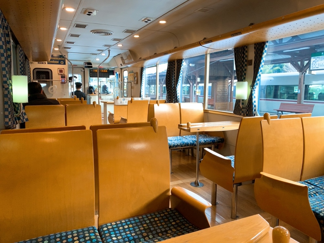 私が乗った時は空いていたので、4人掛けのテーブル席をkeepしました。 何気に背もたれが木で硬く、45分乗っているのは結構厳しかったです。 観光列車として食事などを楽しみながらの移動ならそこまで気にならないのかもですが…。