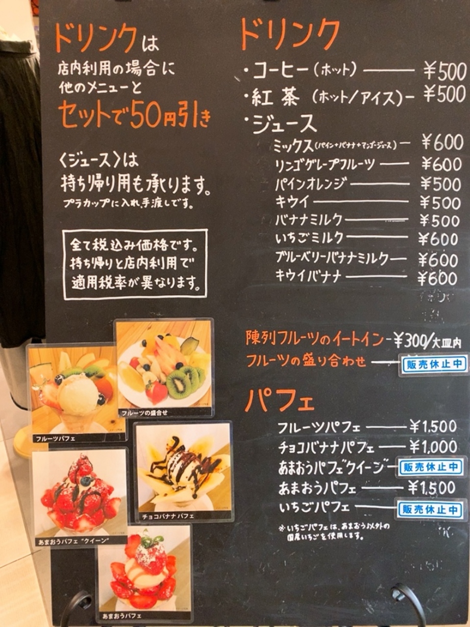 イートインコーナーもあり、フルーツたっぷりのパフェを楽しんでるお客さんもたくさんいました(女性率が高めですね、やっぱり)。