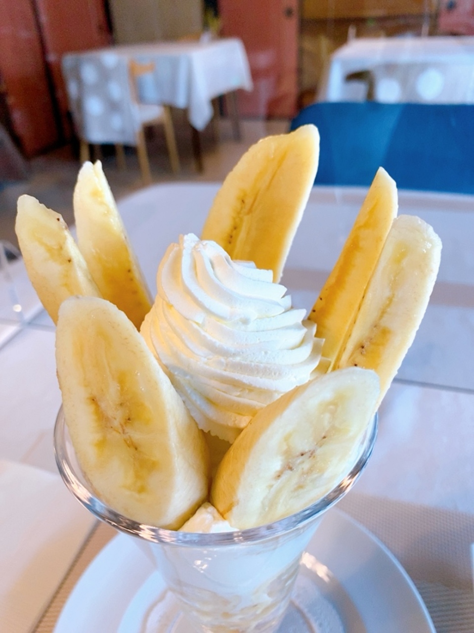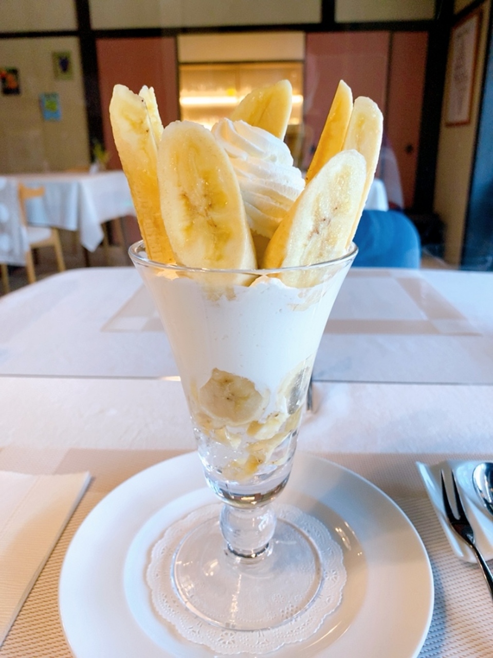 迷った挙句、私はバナナのパフェを注文。 チョコソースを使ってないので、見た目が白く(生クリーム、アイス、ジュレ)キレイです。 値段や見た目からも、大人が楽しんで食べられるパフェという感じですね。