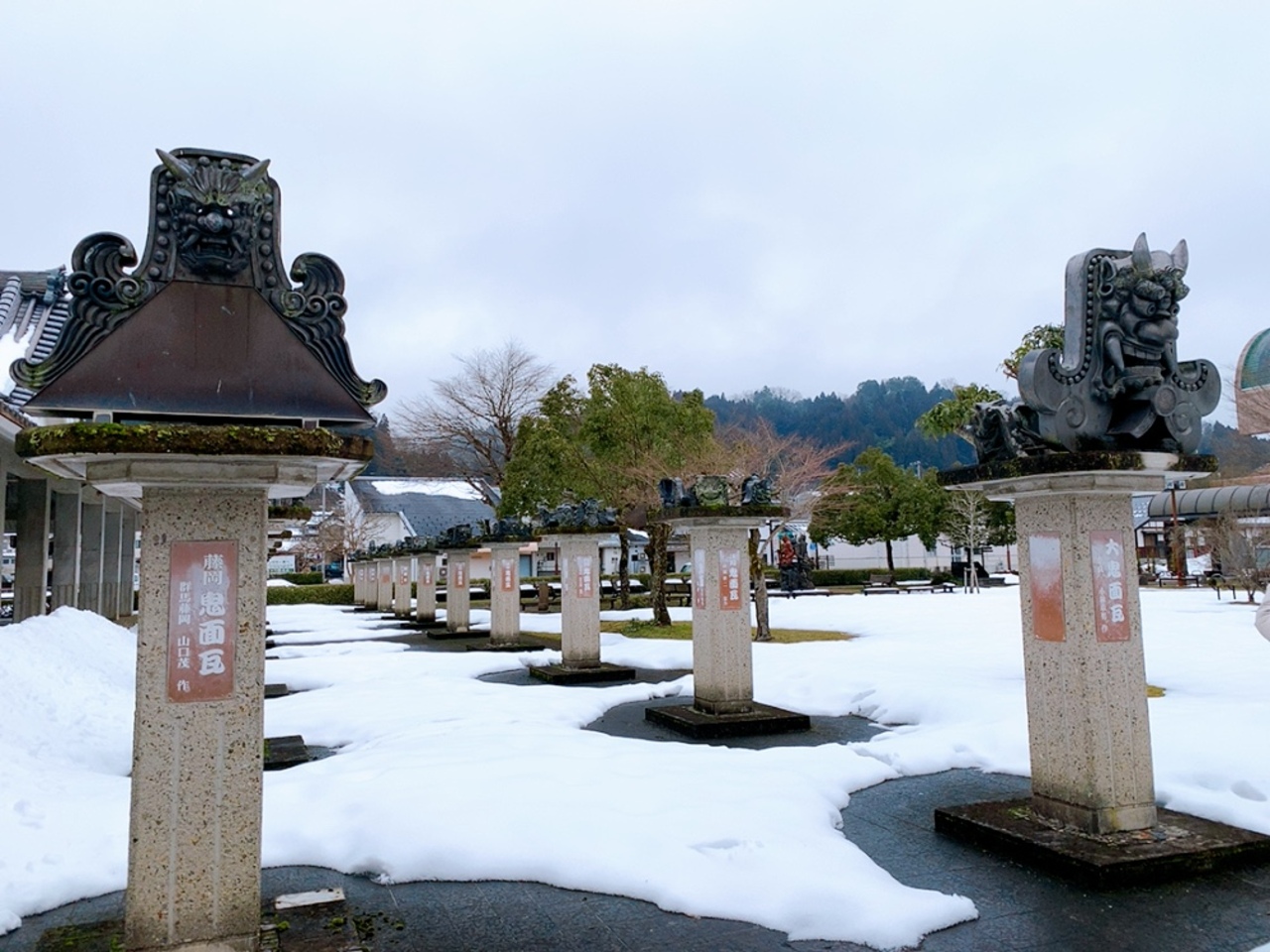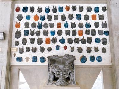 駅前に広がるエリアは、鬼瓦公園と呼ばれていて、立派な屋根で覆われた建物の壁には、色とりどりの鬼瓦が展示されていました。