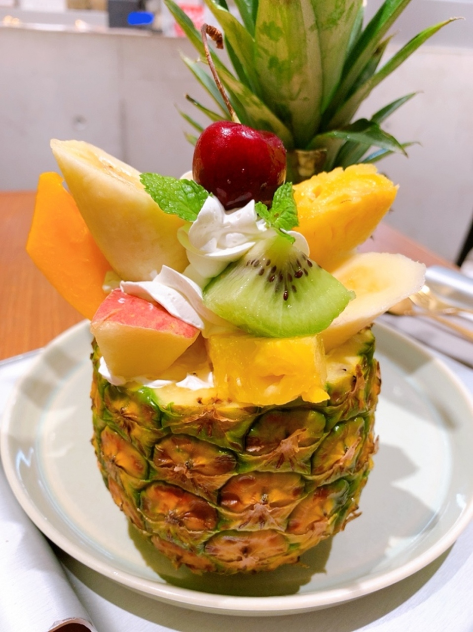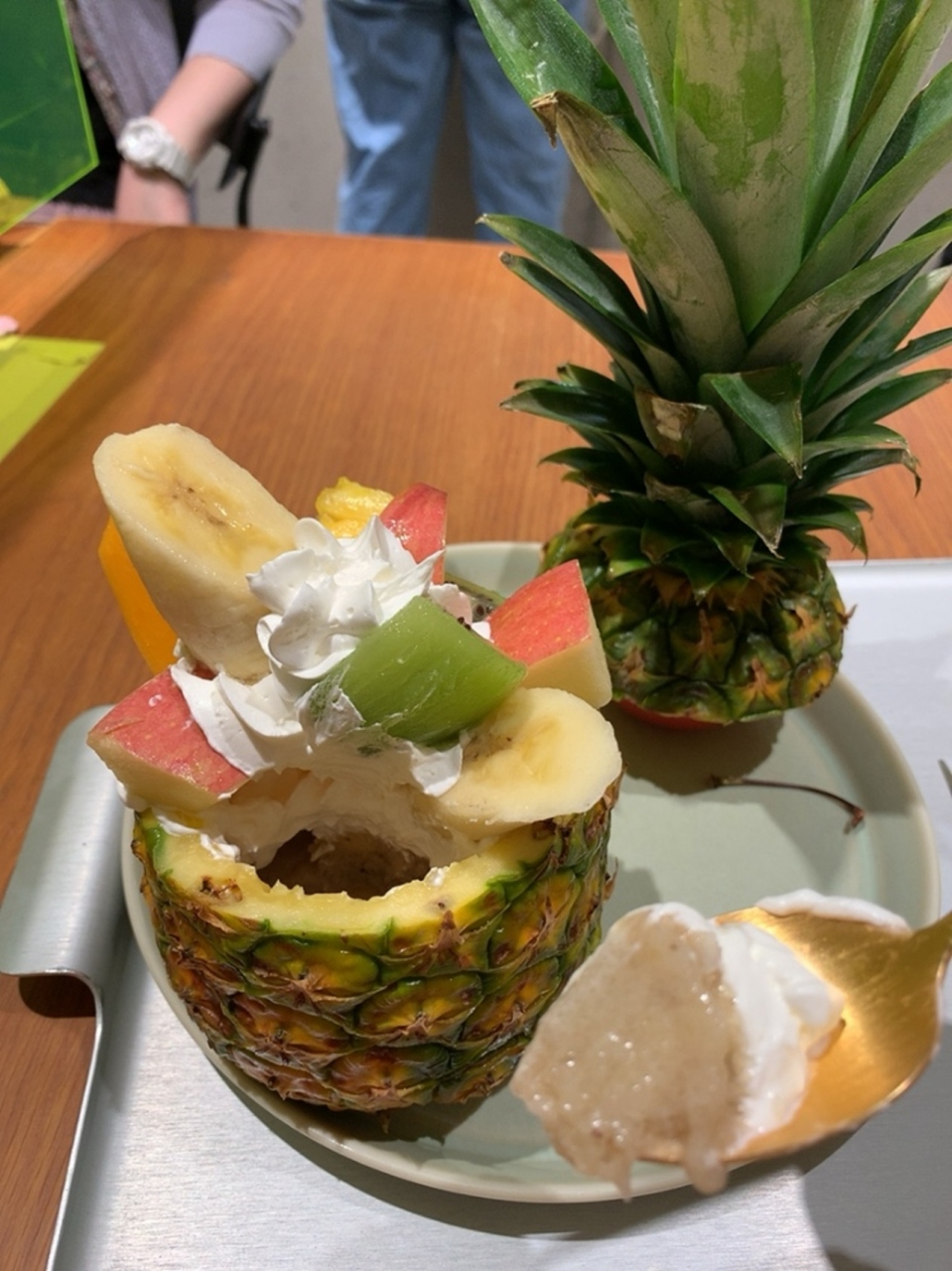 私は、見た目が素晴らしいかき氷を狙って行きましたが、11時には到着して案内していただけましたが、丸ごとメロンのかき氷は既に売り切れ。 見た目が独特な、丸ごとももすもも(おしりがのってるみたいな見た目w)はまだありましたけど、あんまり惹かれなかったので、パフェのような果実園というメニューを注文。 くり抜いたパイナップルの皮の中にバナナの果実入りのアイスと生クリーム、上にもふんだんに新鮮なフルーツをのせた豪華メニューでした。