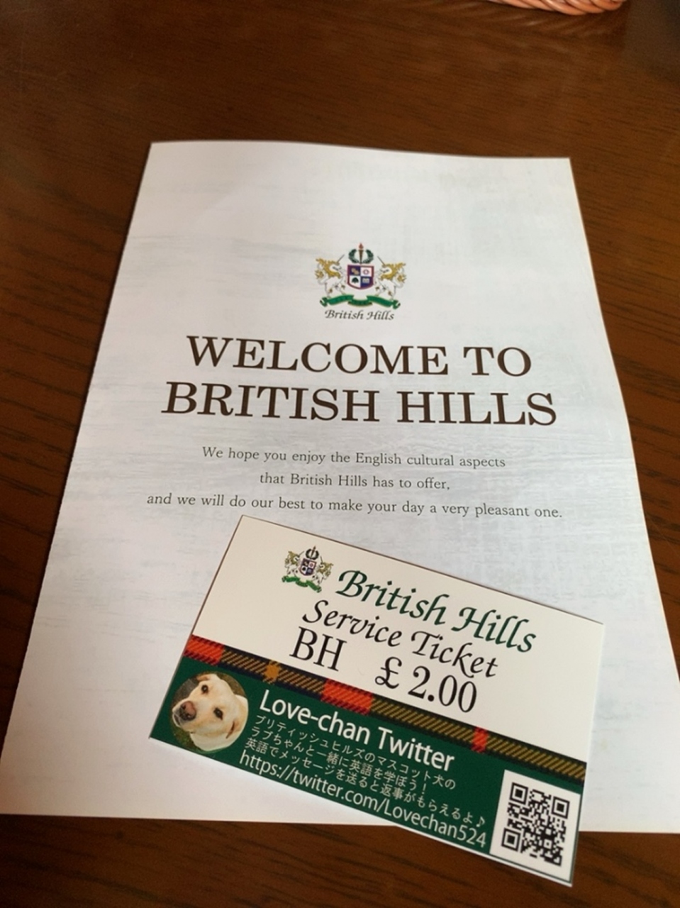 かつてヨーロッパの貴族たちが郊外に建てた別荘を模して建てられた、マナーハウスで受け付けをして、説明を受けてから見学開始です。 日帰りで訪れる場合は、入場料200円かかりますが、受付時に頂くサービスチケットが、BH(British Hills)£2.00分になってるので、施設内で200円分の買い物や食事に充当でき、実質無料って感じになります。