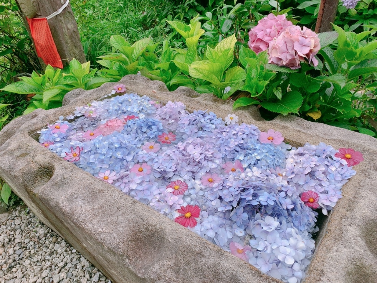 境内はそこまで広いわけでは無いのですが、階段ごとに紫陽花のガラスボールが飾られていて、パステルカラーがとってもキレイでした。 この時期に咲く、珍しいコスモスも所々に咲いてて、花手水にコスモスと紫陽花が一緒に飾られているのもとってもキレイでした。 SNSで話題になっていたので、かなり混み合っていましたが、キレイな写真を撮れてよかったです。