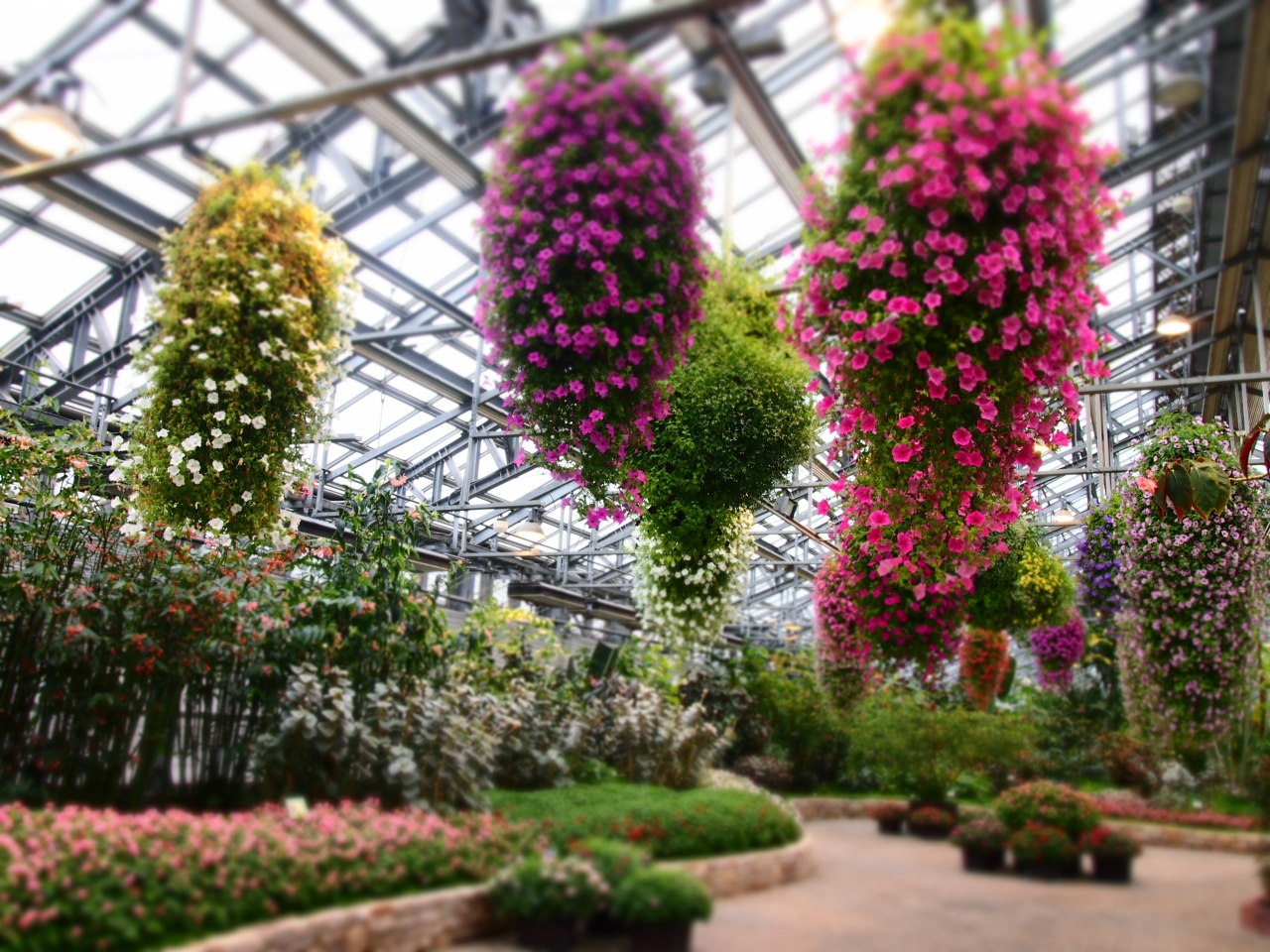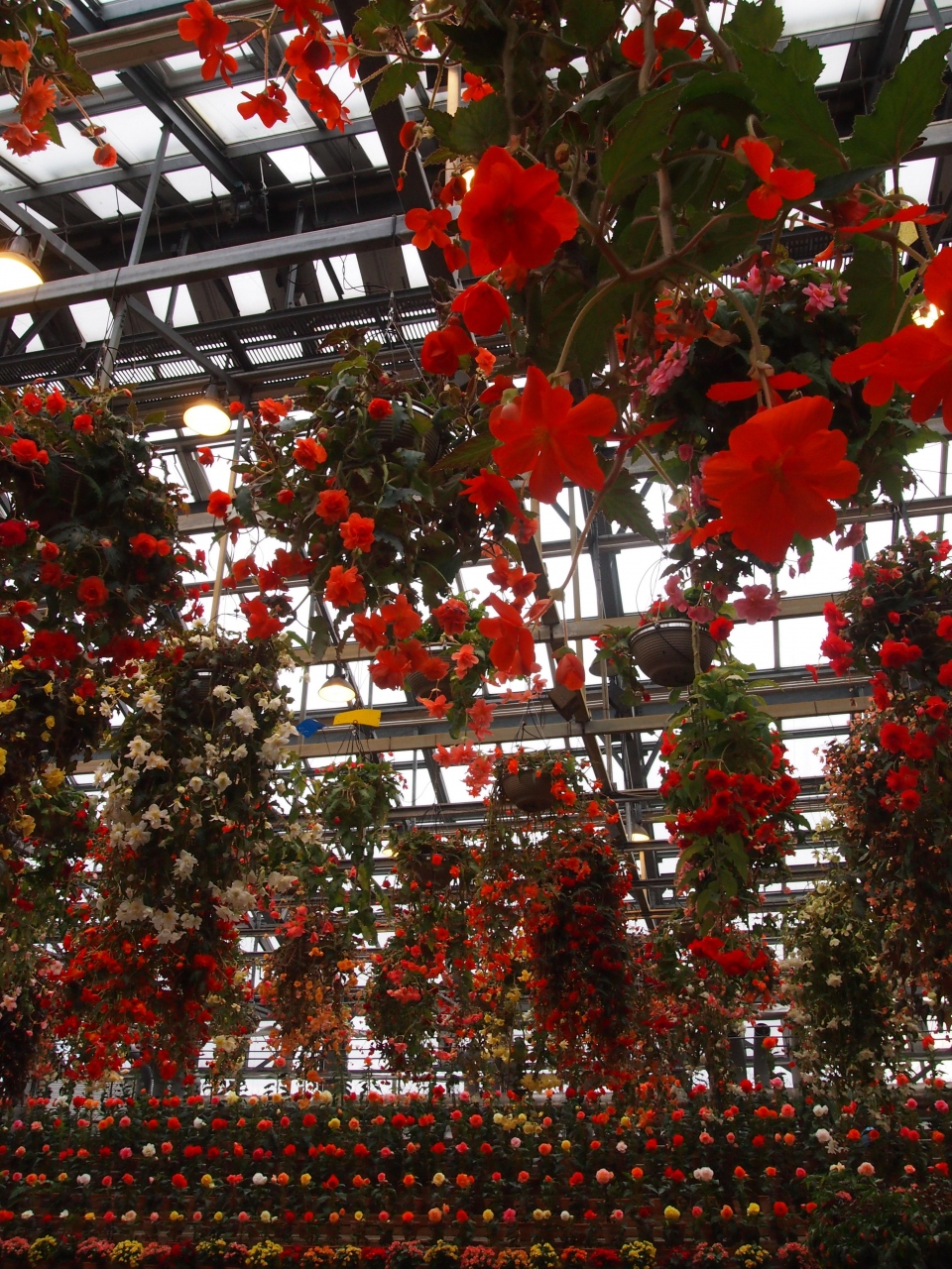 ベゴニア以外にも、天井からぶら下がるペチュニアなども楽しむ事が出来ます。