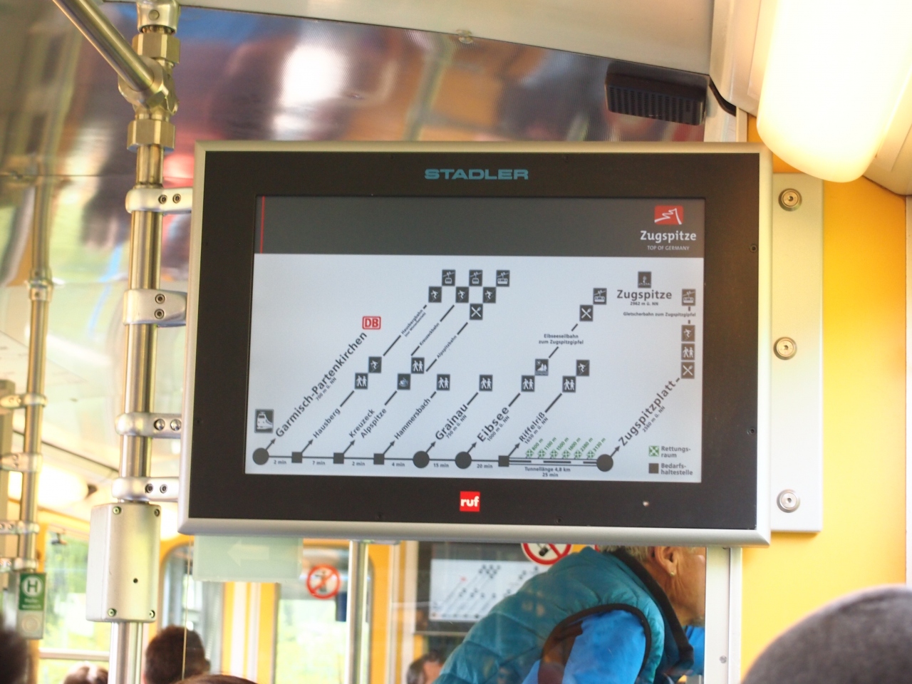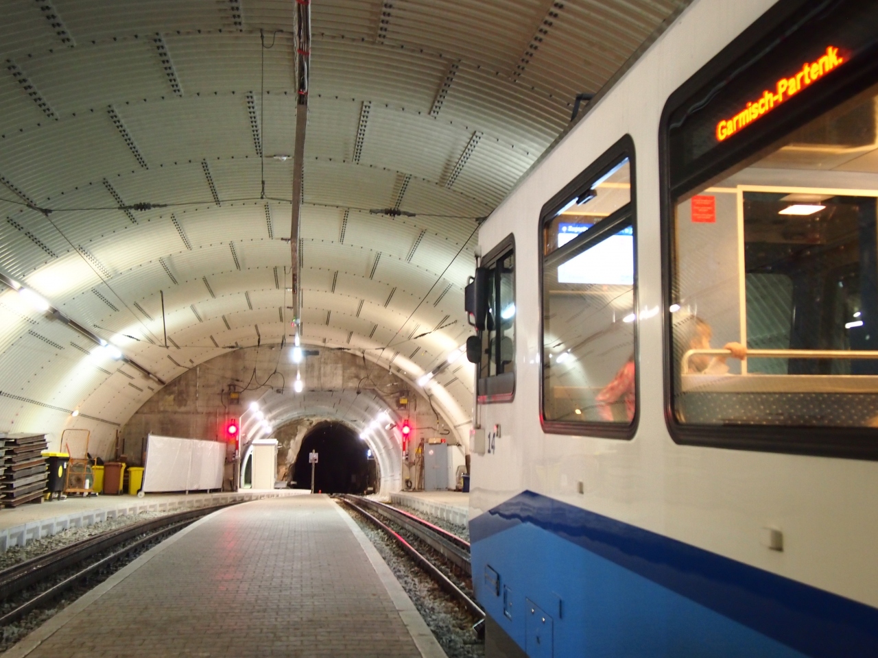 ガルミッシュ・パルテンキルヒェン(麓の駅)から登山電車でアイプゼーまで行き、ロープウェーか別の登山列車への乗り換えです。 その時点で天気が良ければ、ロープウェーからのアイプ湖の景色が本当に素晴らしいので、ロープウェー乗り換えをおすすめします。 乗換の時間的に便利なのは、登山列車乗り継ぎのようですが、これは山の中に掘られたトンネルをひたすら進むので、20分近く真っ暗です。 頂上近くに到着した時の素晴らしい景色を楽しみに出来るのは良いかもしれません。