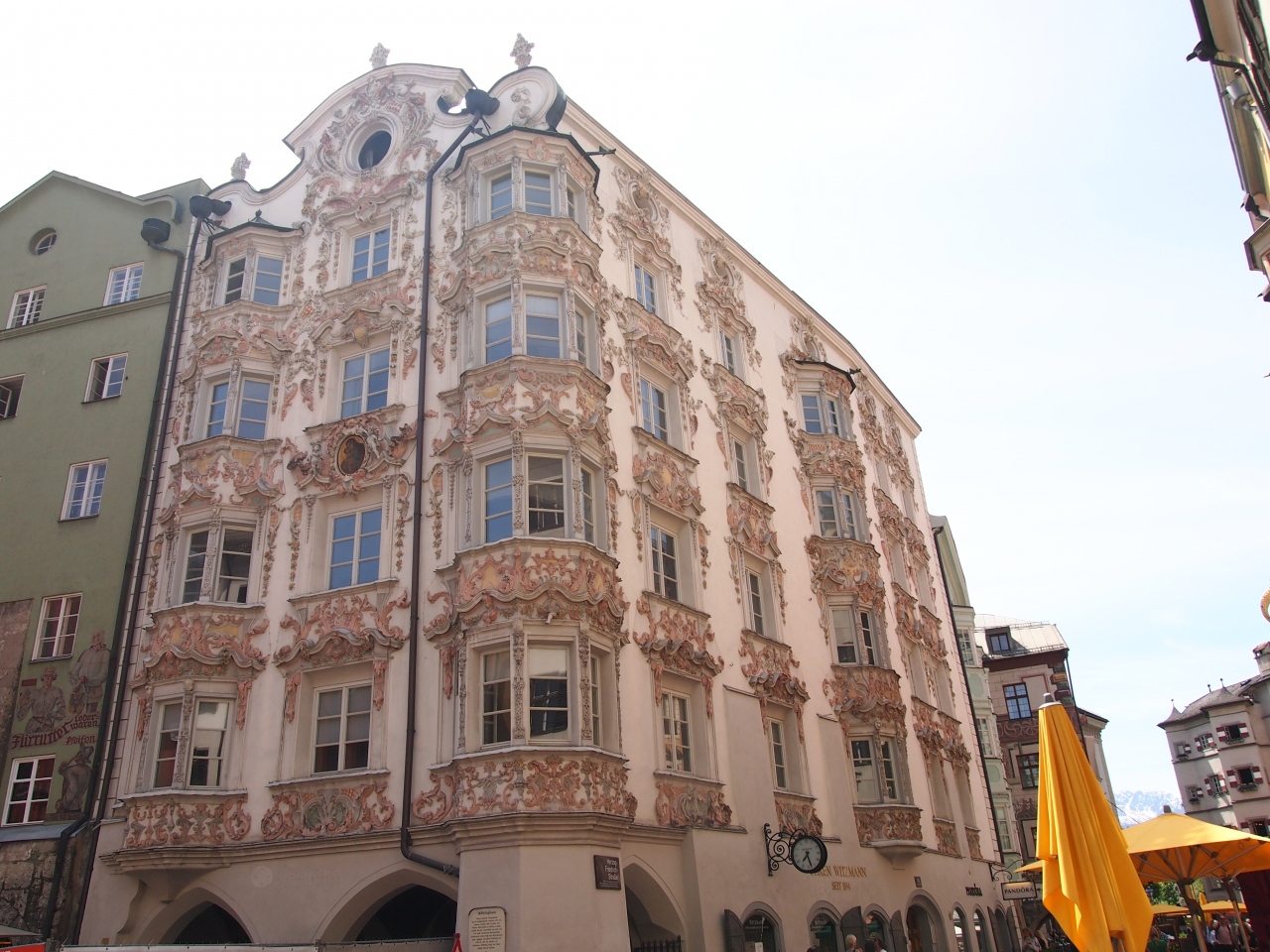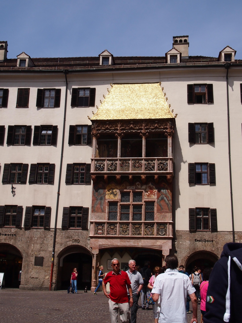インスブルック旧市街の観光で有名スポットの1つ、黄金の小屋根です。 屋根の銅板2657枚は全て金箔が貼ってあるとの事で、ここだけ異様に金ぴか☆