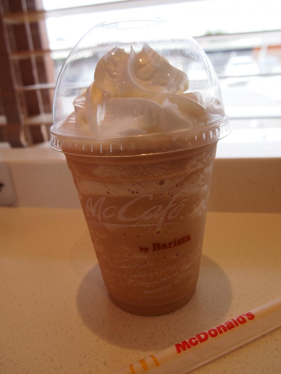ちなみに、金曜日のお昼時に行きましたが、ちょうど1学期の終業式の後だったからか?、店内は激混み!! 大行列に並んで買うことに…。 ハンバーガーは食べる気なかったので、マックカフェ専用のカウンターに並べば良いのか、それとも、ハンバーガー買う人たちの列に並んで買えば良いのか勝手が分からず…。 ちなみに、マックカフェ専用のカウンターはお客はゼロ(店員もいない)。 結局はハンバーガーの列に並んで、マックカフェのエスプレッソ・フラッペを注文しました。