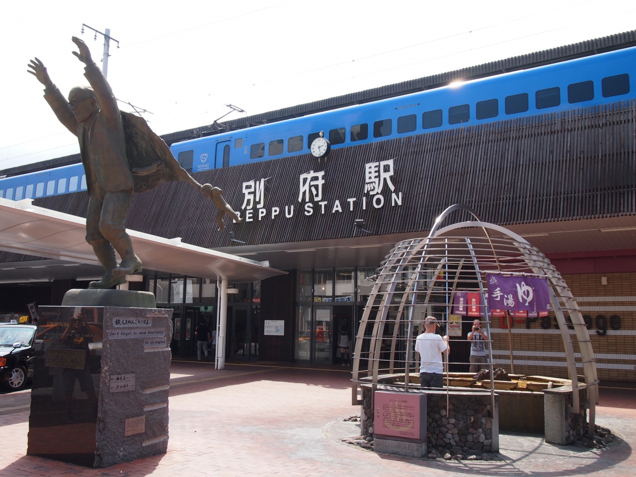 駅前には、面白い銅像が。 後から調べてみると、別府の観光開発に尽力した、油屋熊八という実業家の銅像だそうです。