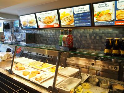 店内は、メニューの写真は美味しそうだけど、いかにもチェーン店って感じです。 フードコートみたいなセクションから、おかずやサラダを何種類で○ユーロって感じで、店員さんが盛ってくれます。 メニューはドイツ語で読めないので、指さしでOKです。