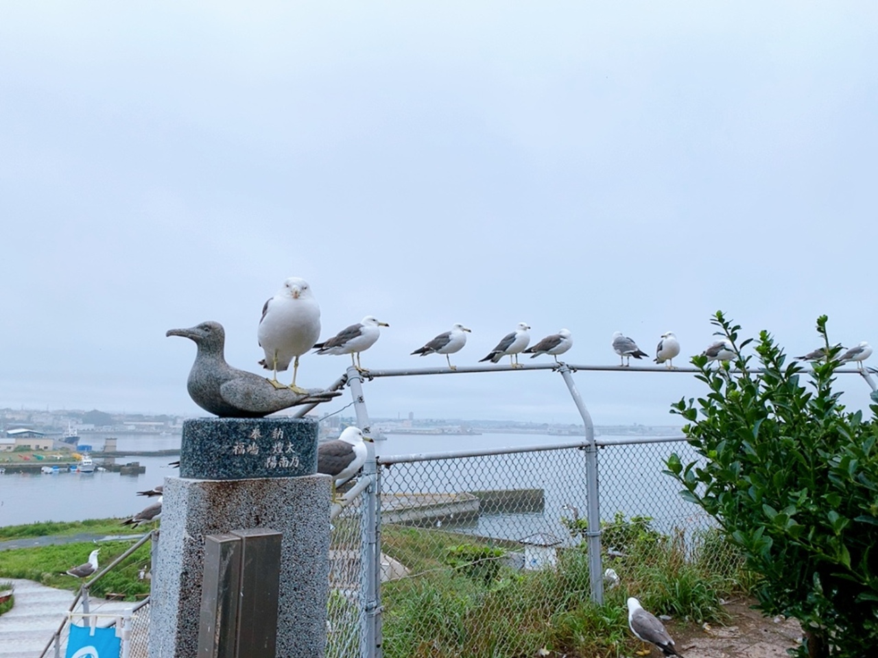 蕪嶋神社と言ったら、ウミネコの繁殖地として有名。 遠目からでも、鳥居の上などに等間隔にウミネコがいるのが確認できます。 フェンスにもズラ~っとウミネコがぎっしりとまっていて、鳴き声もかなり賑やかです。
