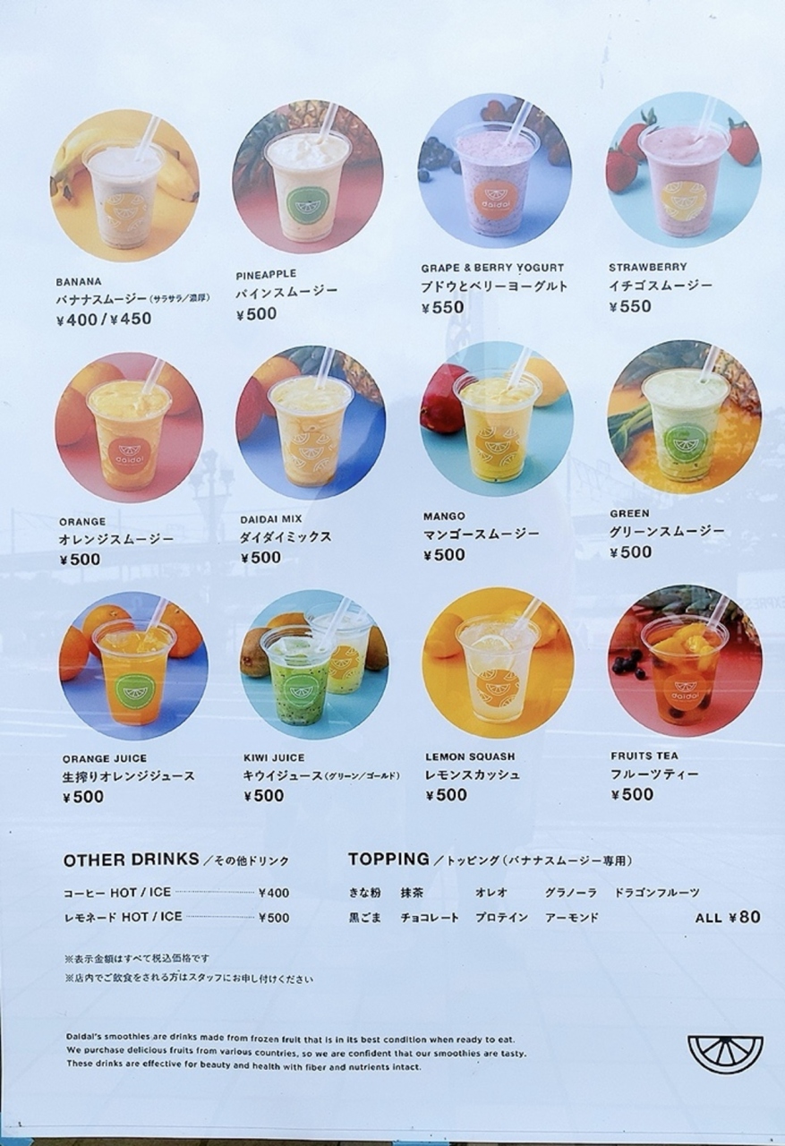 スムージー専門店なので、色々な種類のスムージーがあります。 フルーツサンドも色々な種類があり、美味しそうでした!