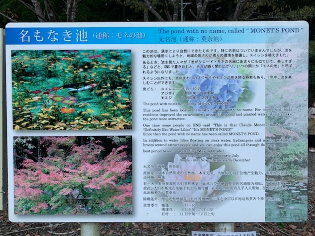 名もなき池(通称: モネの池)は、驚くほどの池底までクリアに見える程澄んだ池です。 お金をかけて特別な清掃や管理をしてるわけじゃなくて、湧き水のおかげで自然の状態でこんなキレイな池なんだそうです! 今後も観光客が汚したりすること無く、キレイに保っていければと思いました。